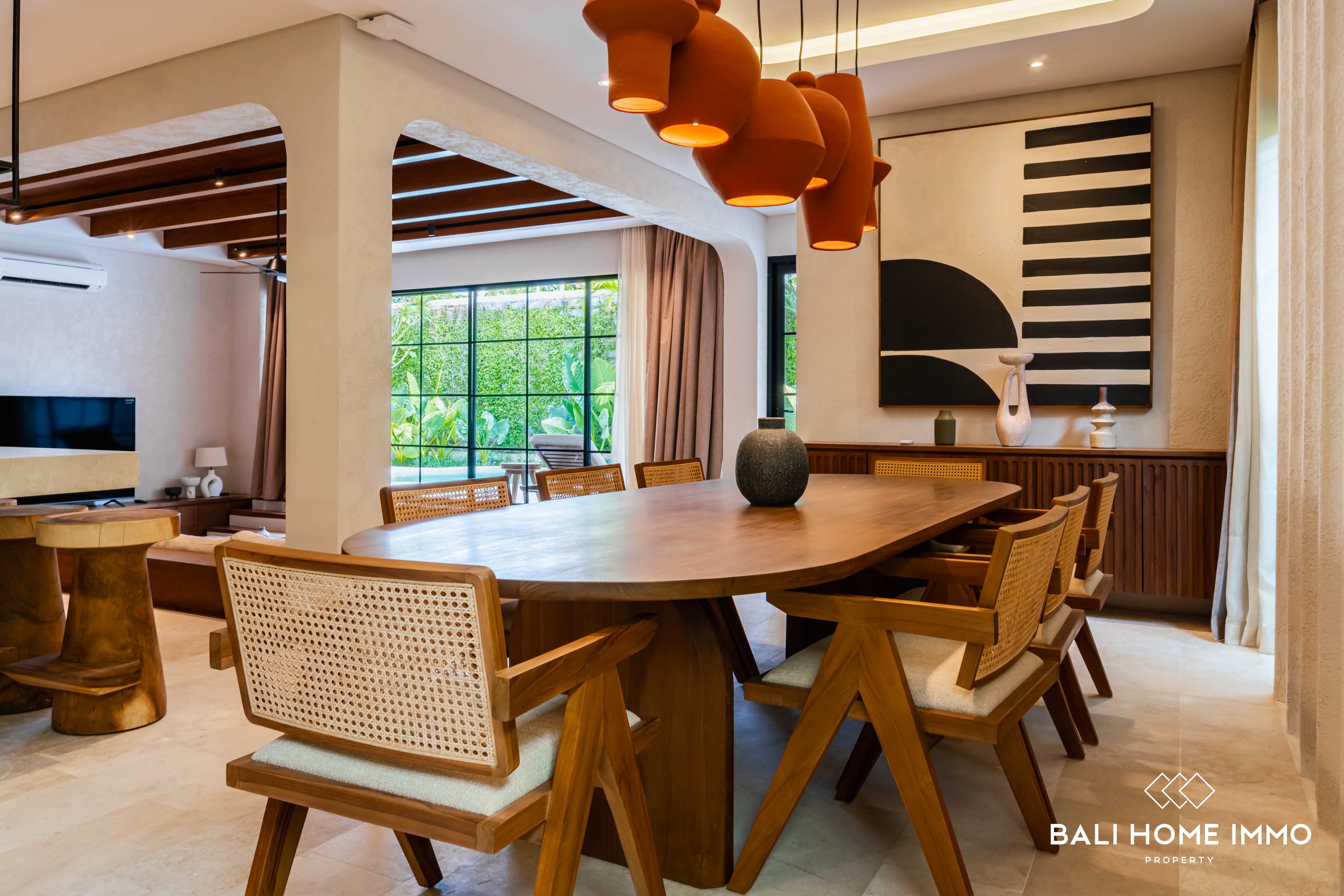Designed by Anissa Cibu, each property features chic European-inspired interiors, an open-plan layout, and a swimming pool with an outdoor sofa area. The modern kitchen flows seamlessly into the dining and living areas, and one of the ensuite bedroom opens up to the pool area. Upstairs, there are two ensuite bedrooms and a luxurious master suite with a balcony. The property features bespoke furniture made of teak wood and legally reclaimed Ulin wood from various parts of Indonesia, as well as high-end equipment from acclaimed brands including Kohler sanitation and Miele appliances. This particular villa offers unique features that other villas in the residence doesn't have, including smart technology (for curtains, ACs, speakers, etc) controllable via smartphone app, two-car carport with dedicated outlet for charging station, and utmost privacy due to being located at the end of the cul-de-sac.