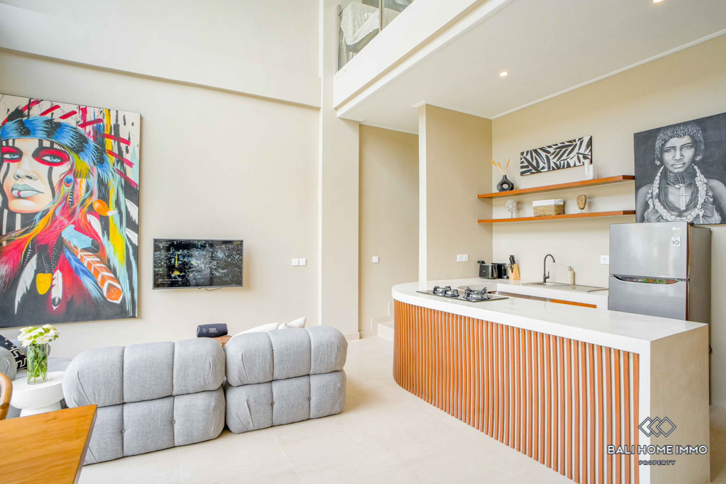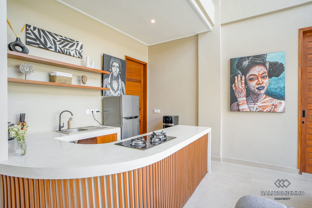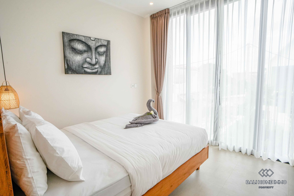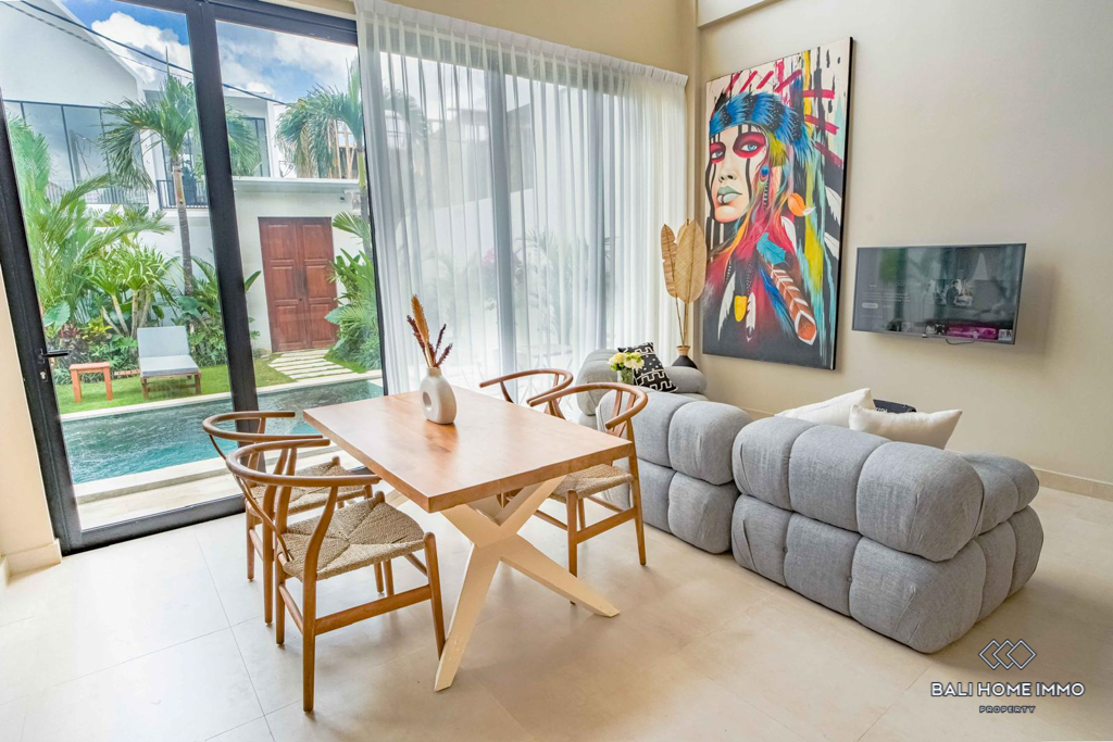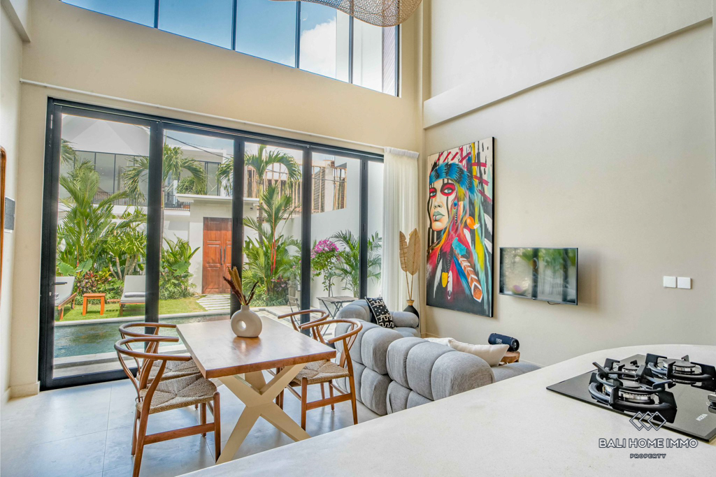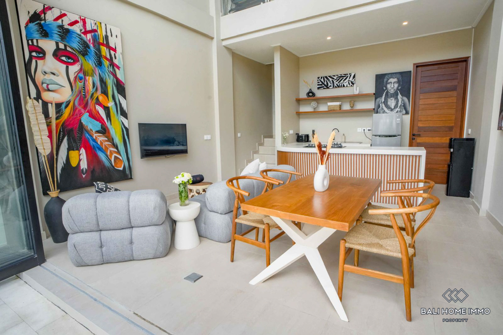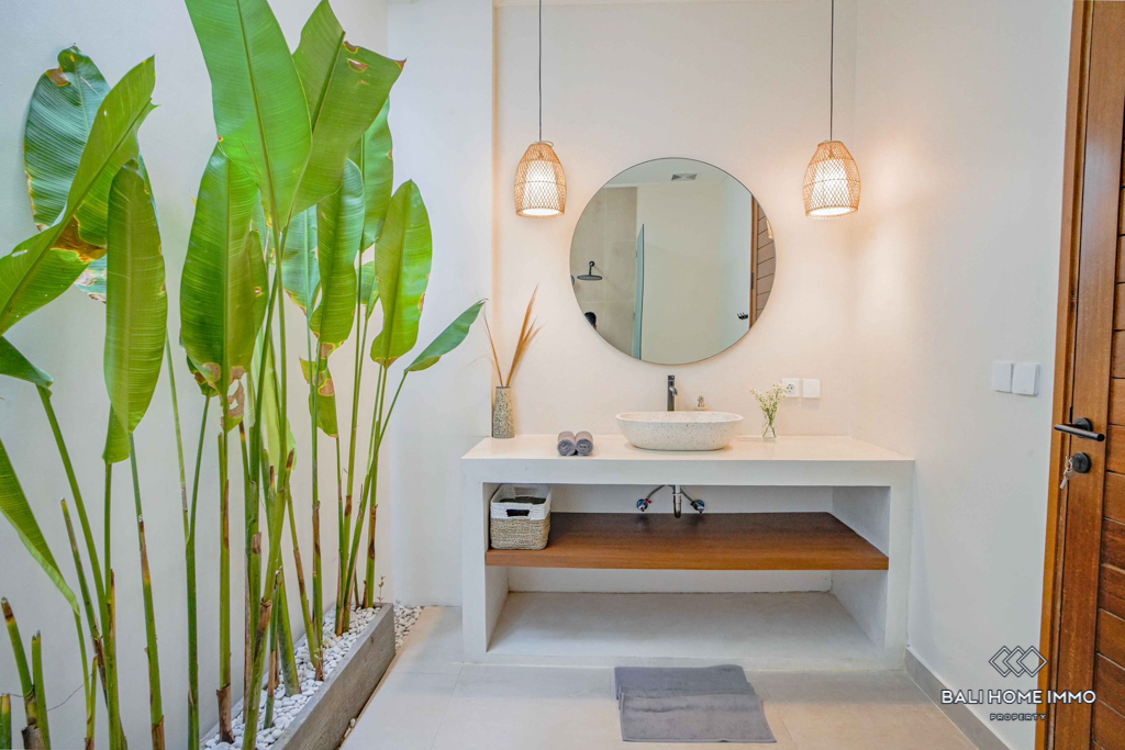 This stunning two-bedroom villa in the peaceful residential side of Canggu offers the perfect blend of modern design and comfort. Built on two levels, each bedroom features its own private ensuite bathroom, ensuring convenience and privacy. The villa comes fully furnished with stylish contemporary pieces, highlighting the enclosed living and kitchen area as a warm and functional hub for daily life. A dedicated storage room adds practicality, while the indoor balcony lounge with a sofa provides a cozy retreat to relax and unwind.