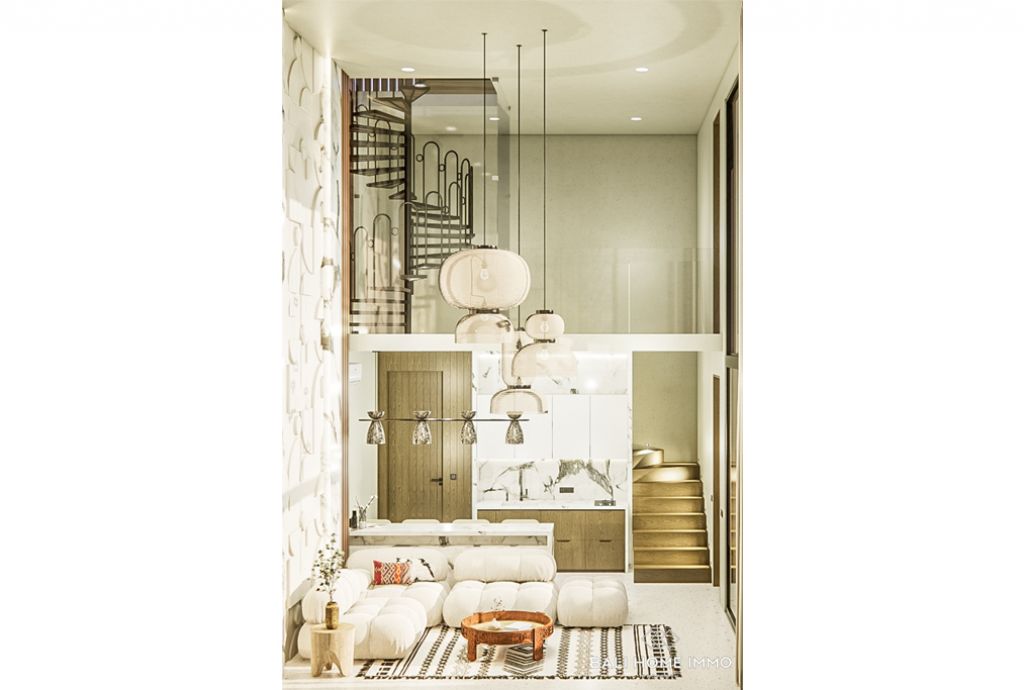 Set on a modest land size of 0.64 are, the well-crafted building spans 77 mยฒ and is scheduled for completion in August 2024. Elevated on the second floor, the enclosed living room provides a private haven, while the outdoor space features a refreshing swimming pool, an ideal place for relaxation.