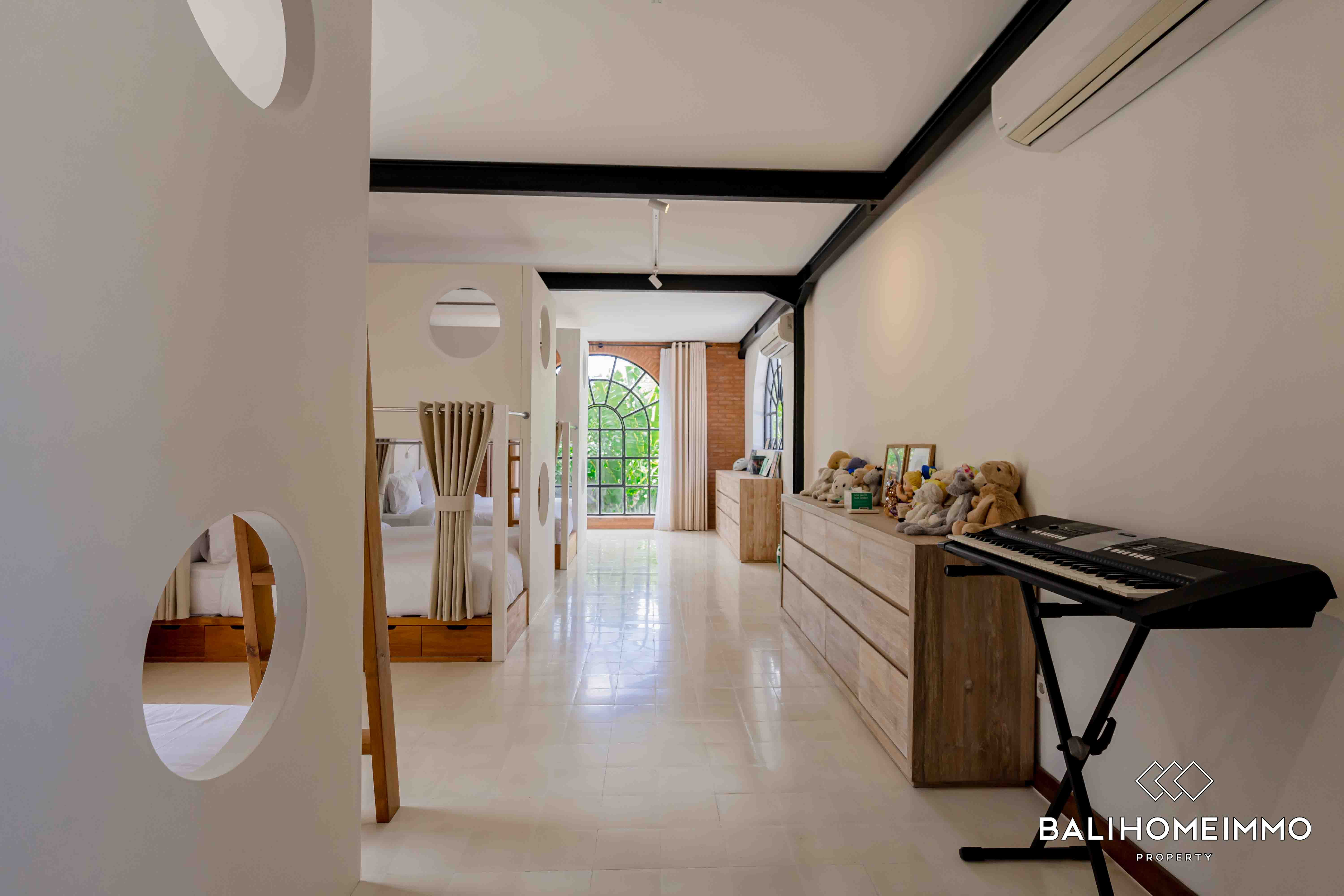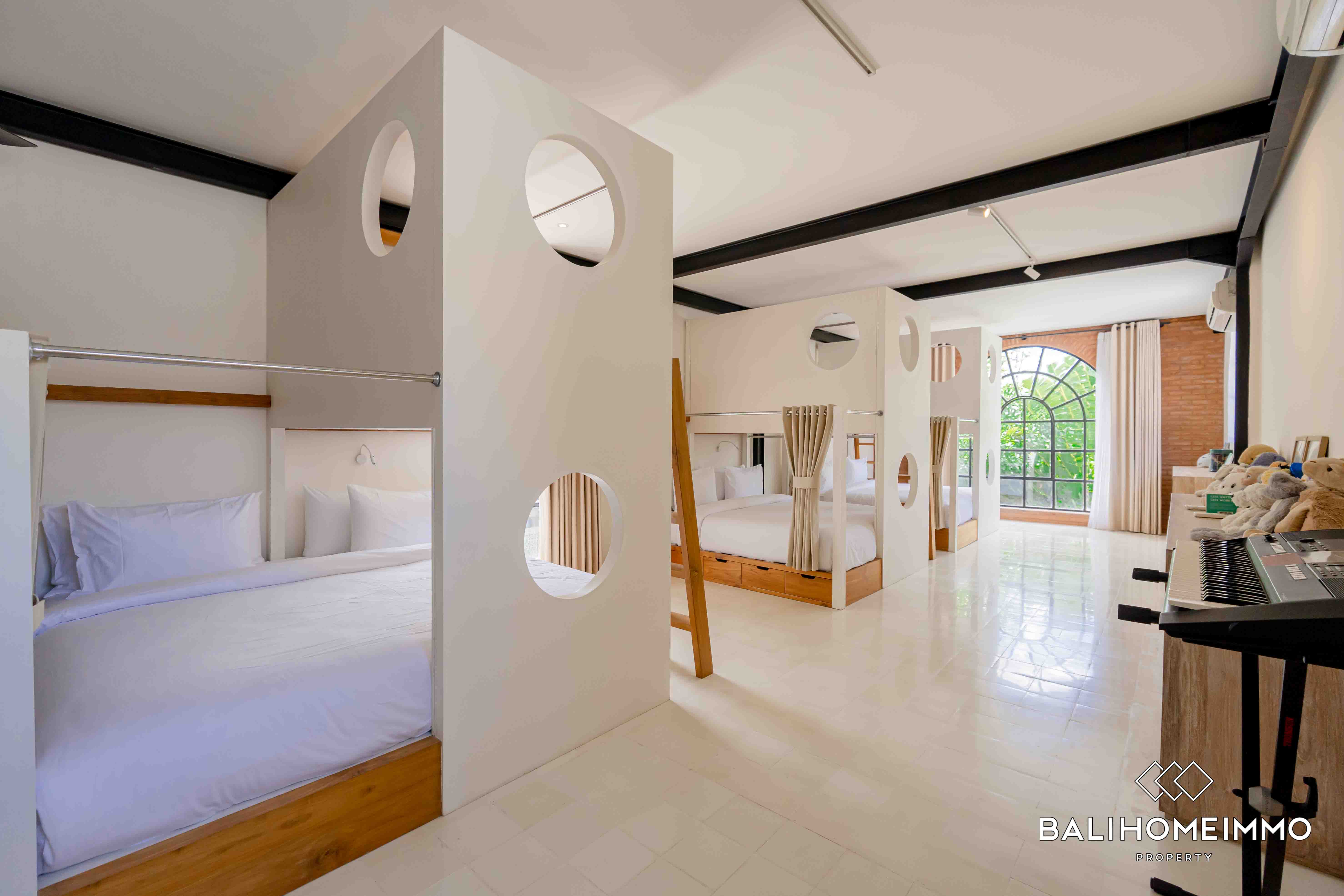 This modern villa is located in the touristic area of Batu Bolong in Canggu, only an 8-minute walk from the beach and surrounded by a variety of amenities such as restaurants, cafes, and shops, making it convenient for residents to access everything they need within a short distance. This two-level villa boasts a spacious 600 square meters of building space and sits on 9 are land.