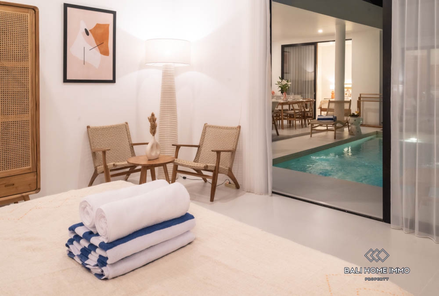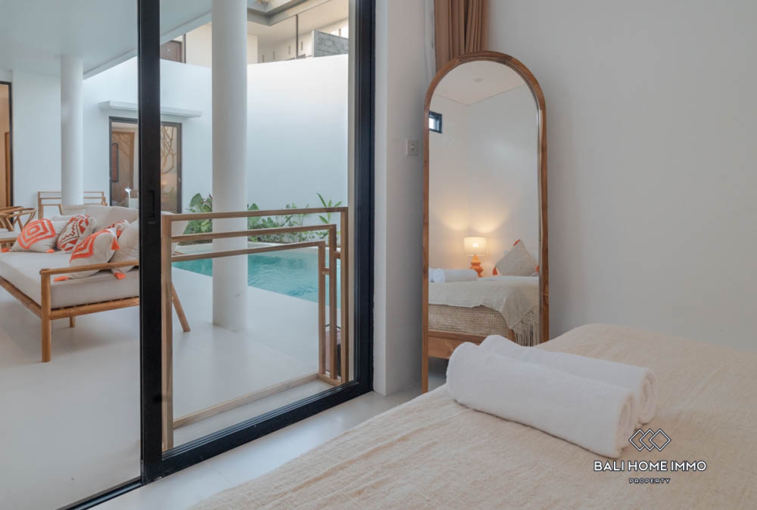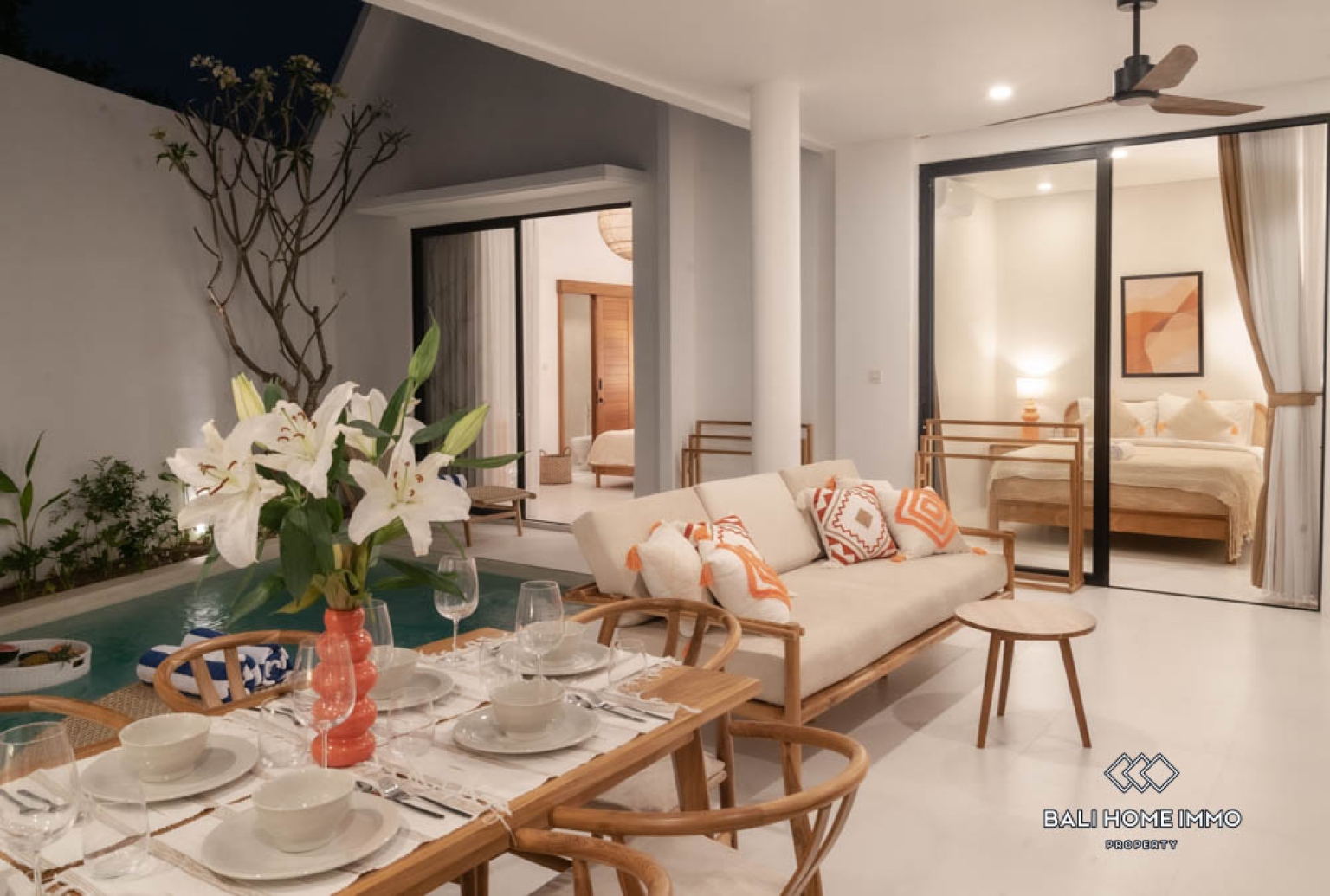 The villa features two well-appointed bedrooms, each designed with contemporary furnishings and soothing color palettes that promote relaxation. Both bathrooms are sleek and modern, reflecting a clean and refreshing design. The open kitchen is fully equipped and complemented by wooden finishes that enhance the homeโs tropical-modern charm. With two air-conditioning units installed, residents can enjoy cool comfort in every room. The open living and dining area provides a stylish setting for entertaining or relaxing, perfectly suited for Baliโs indoor-outdoor lifestyle.