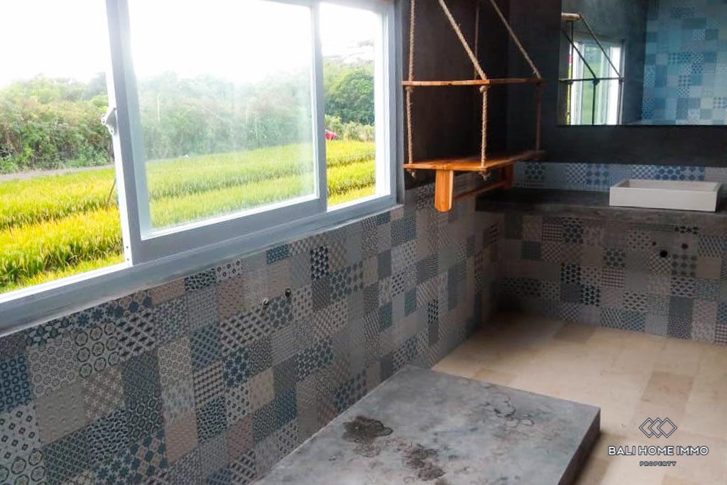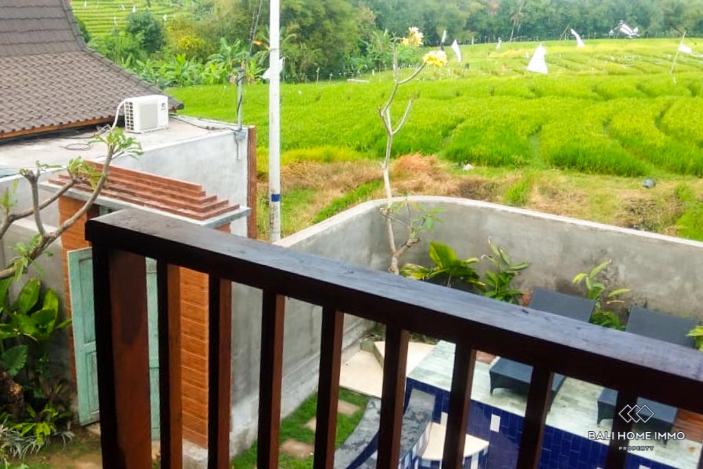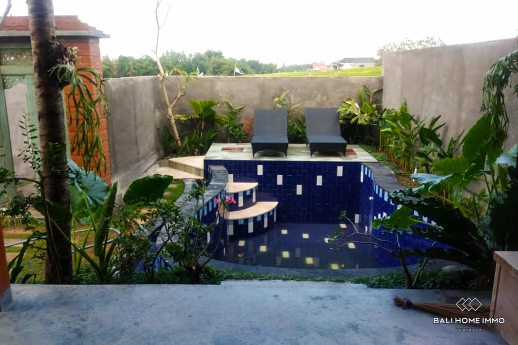 The villa features two bedrooms, each with its own ensuite bathroom. The second floor includes a balcony that overlooks the rice fields, offering breathtaking views and a peaceful retreat. The private swimming pool is surrounded by greenery, creating a relaxing and tranquil ambiance.