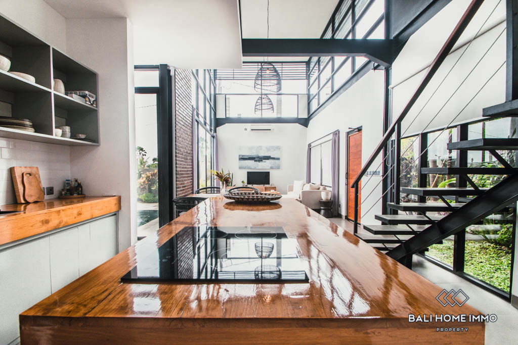The villa combines modern architecture with industrial design elements, boasting an open-plan yet fully enclosed living space built under a double-height ceiling facing towards the pool outside and fitted with floor-to-ceiling windows that provide plenty of natural lighting in the room. The kitchen is fairly equipped with a refrigerator, an electronic ceramic hob, a double bowl sink, as well as polished wood tops for the island and counters. Both bedrooms are ensuite, and the ground floor bedroom opens up to the pool and side terrace while the first floor bedroom opens up to a balcony overlooking the villa’s surroundings.