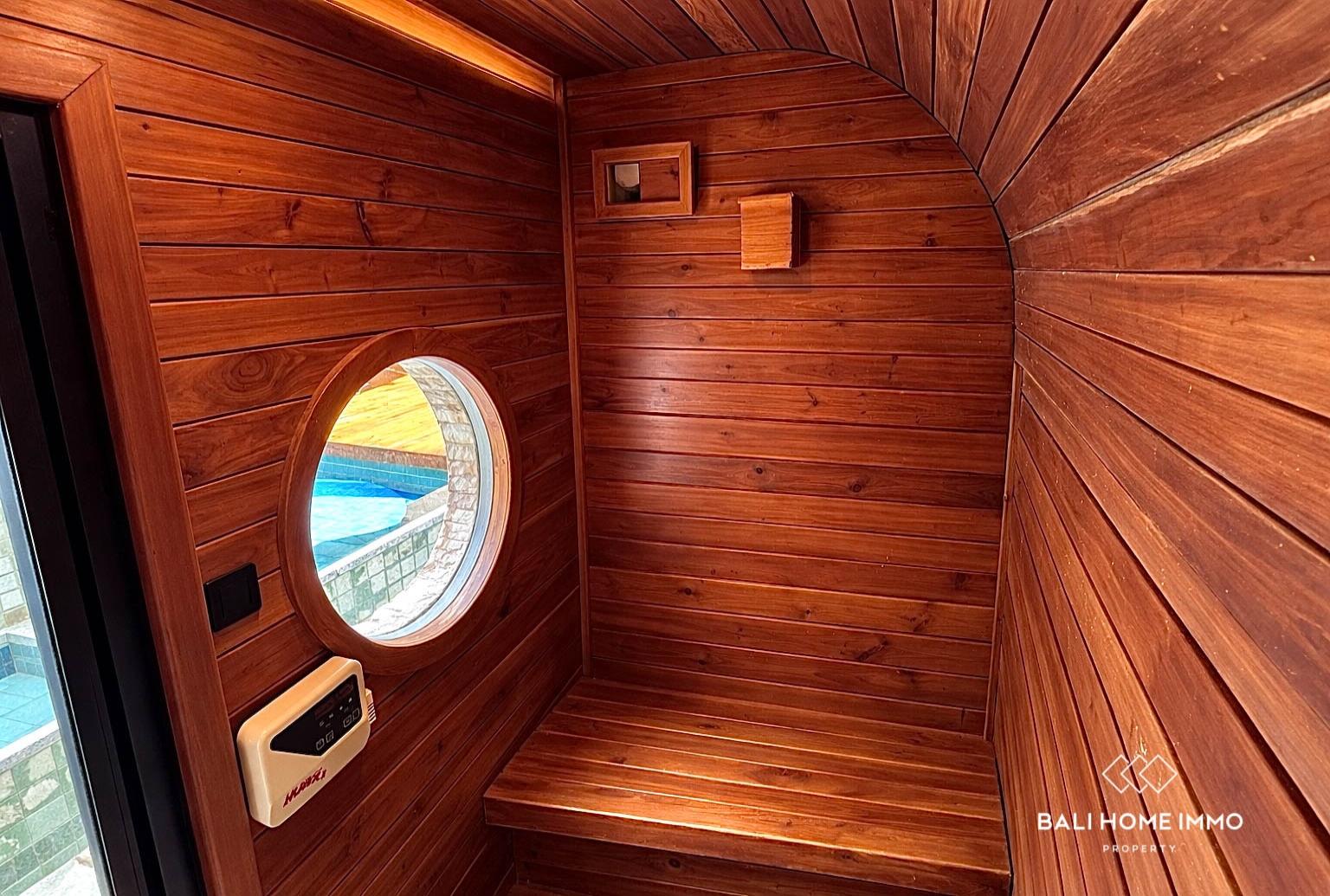 One of the standout features of this villa is its private sauna, offering a unique wellness experience rarely found in similar properties. The outdoor area includes a beautifully designed swimming pool, complemented by clean architectural lines and a low-maintenance layout.