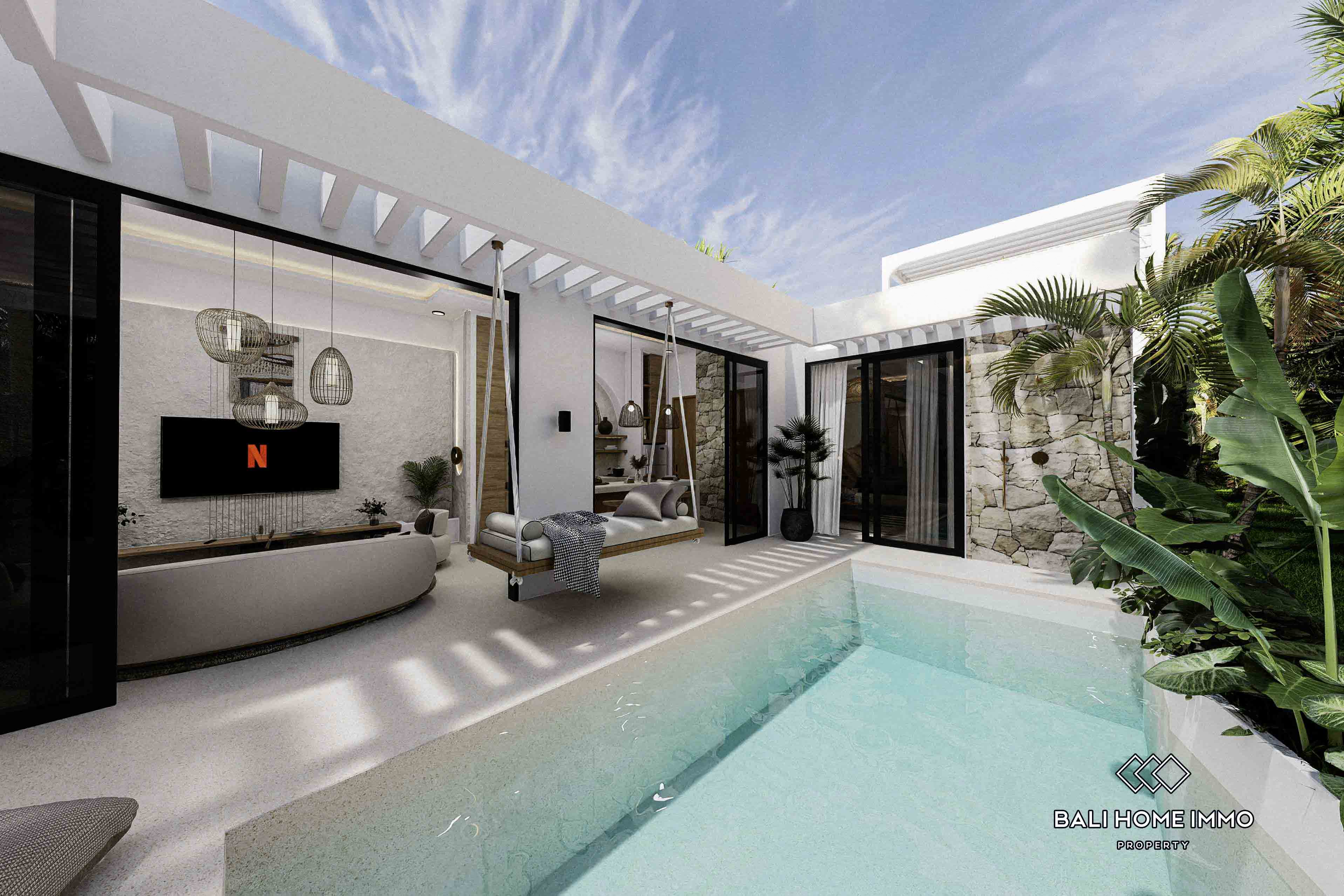 The villa features an enclosed living room and two ensuite bathrooms, ensuring privacy and comfort. Large windows provide stunning views of the pool, allowing natural light to fill the space.