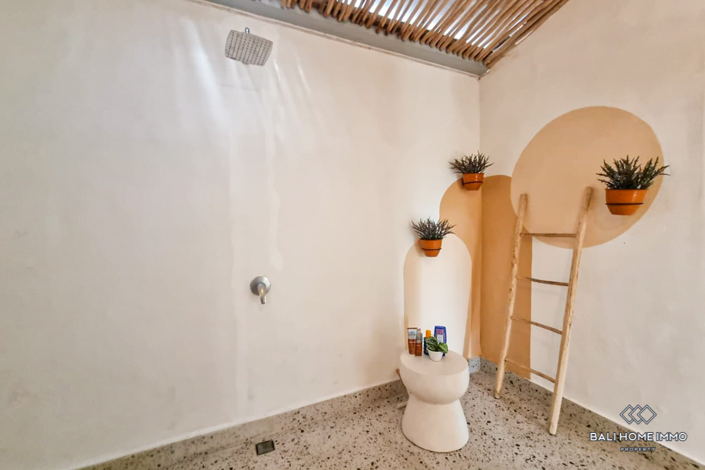 Outside, the villa features a private swimming pool framed by lush plants that bring a sense of calm and greenery to the space. An outdoor shower adds to the tropical charm, while a small storage area, laundry space, and outdoor bike parking make daily living easy and practical. With its warm atmosphere and natural details, this semi-furnished villa offers a simple yet inviting retreat in the heart of Seminyak.