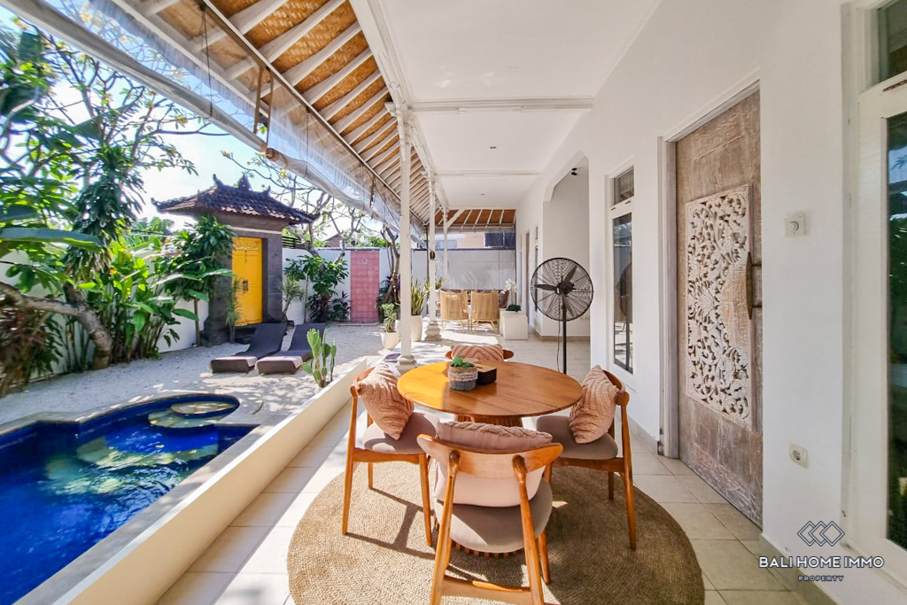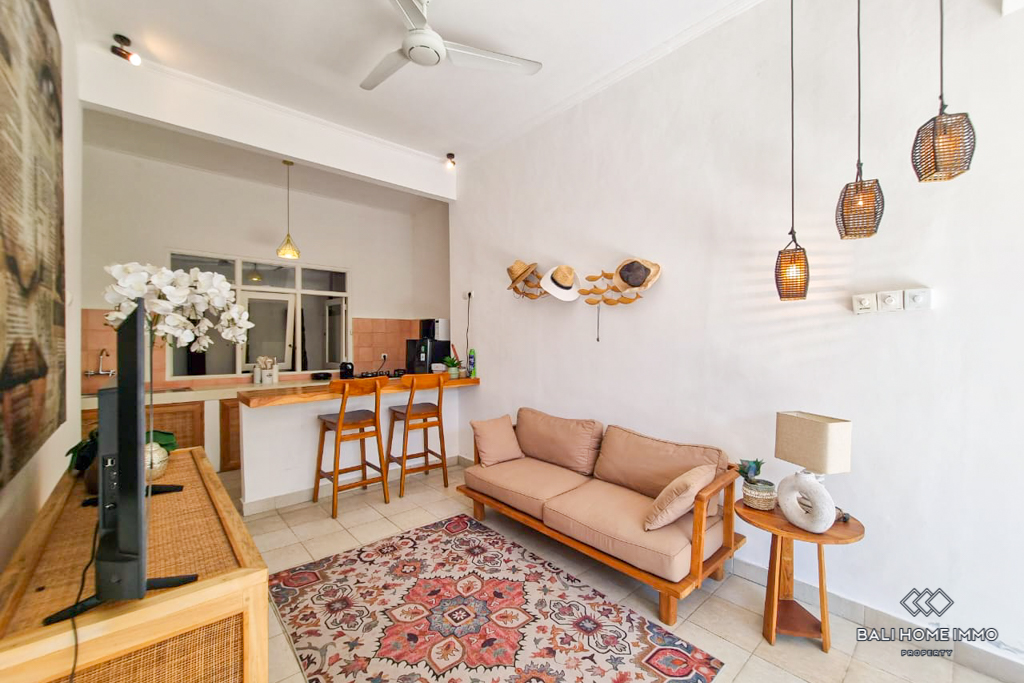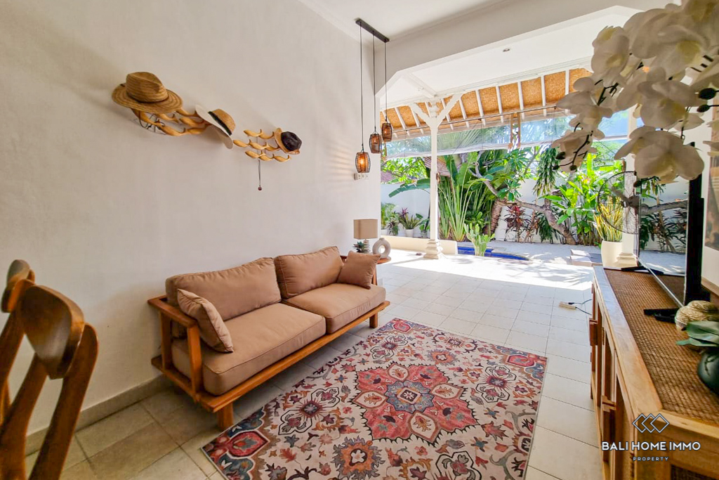 This charming two-bedroom villa in Seminyak captures a cozy island feel with its inviting design and thoughtful layout. Both bedrooms come with their own ensuite bathrooms, ensuring comfort and privacy, while the kitchen sits right in the middle of the home, opening out to the pool and connecting the two rooms. The open living and dining area flows naturally into the outdoors, creating a breezy space that blends everyday comfort with a tropical touch. Set on one level and semi-furnished, the villa offers flexibility for you to add personal touches and make it your own, while still providing the essential furnishings for convenient living. A spacious terrace completes the layout, perfect for relaxing or sharing meals together.