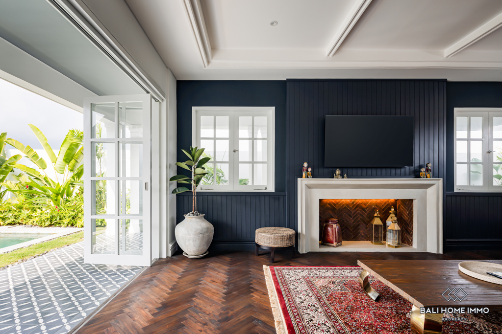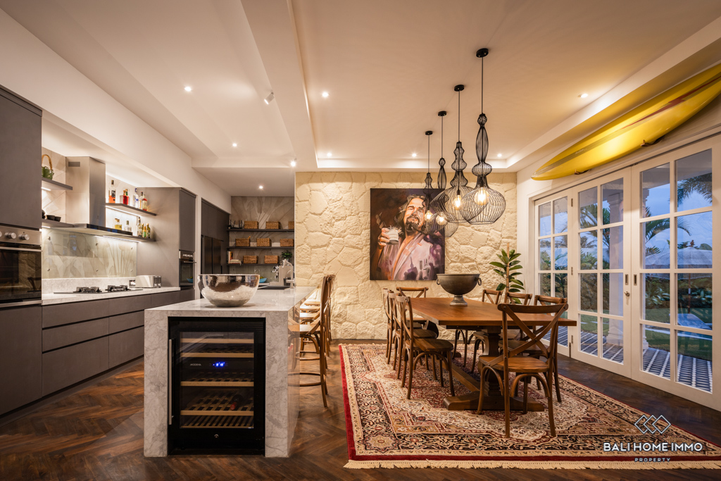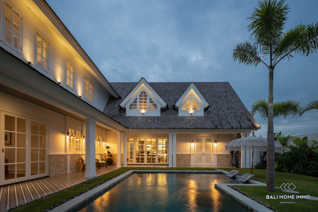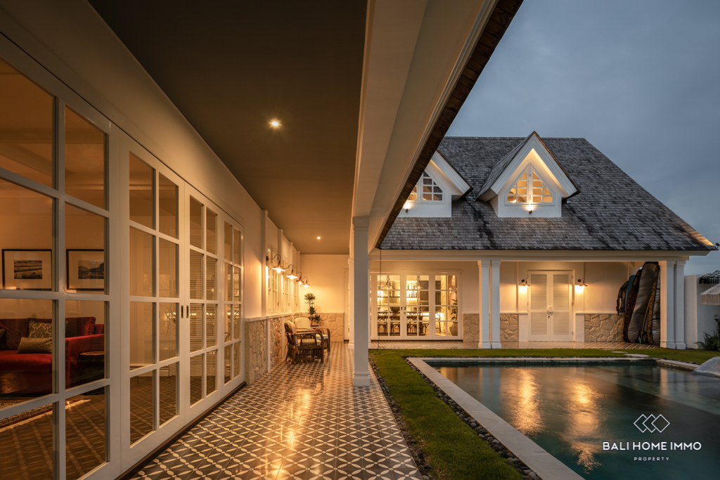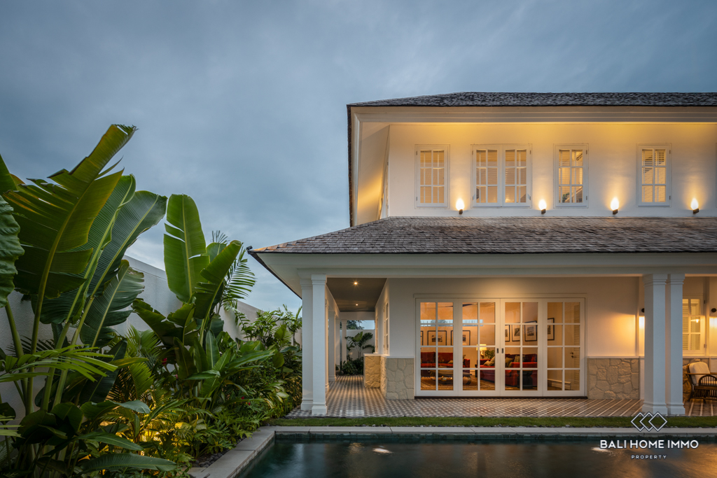 Located just 6 minutes from Munggu Beach, this stunning colonial-style villa in Seseh offers a perfect blend of elegance and modern comfort. Built in 2023, the two-story property spans 360 m² on a generous 5-are plot, surrounded by a peaceful residential area. The villa’s flexible living room can be opened or enclosed, allowing for seamless indoor-outdoor living while enjoying views of the pool and garden.
