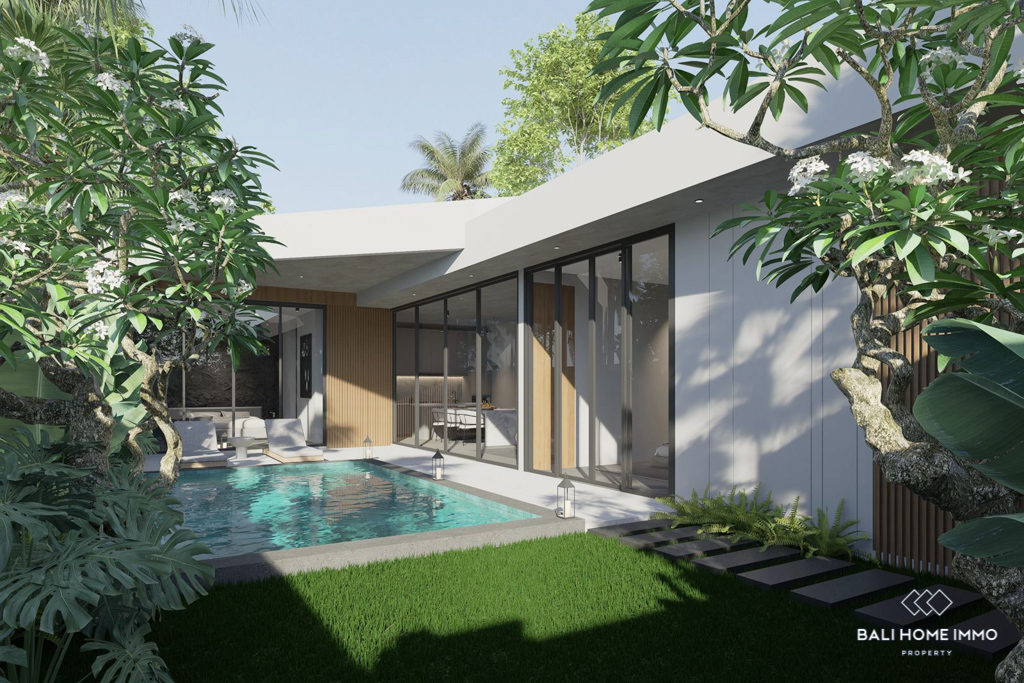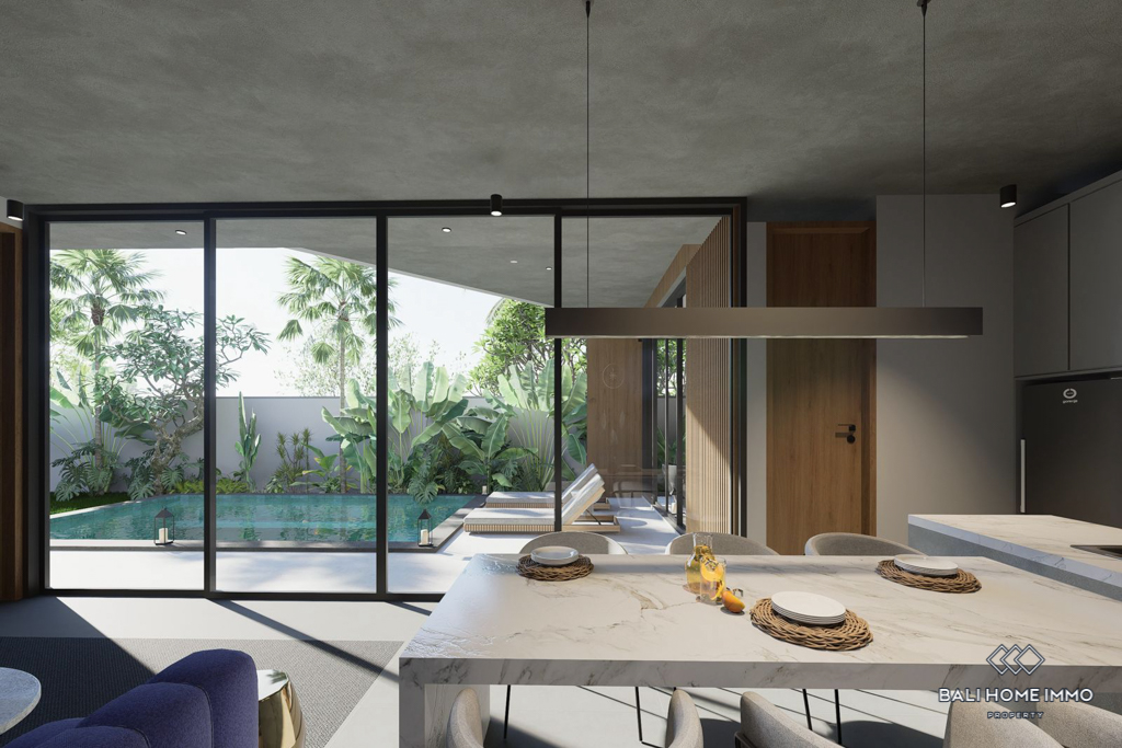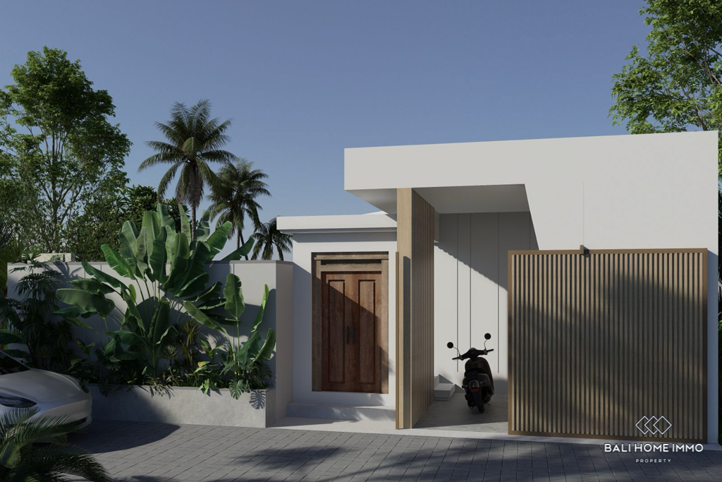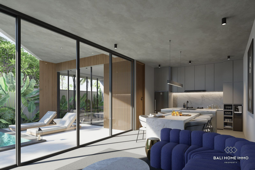 This modern villa in Cemagi, set to be completed in 2024, is located just a 4-minute drive from Seseh Beach. Built on 2.03 are of land with a building size of 100 mยฒ, the single-story villa offers a tranquil living experience in a popular touristic area. The enclosed living room provides privacy and comfort, creating an inviting indoor space.