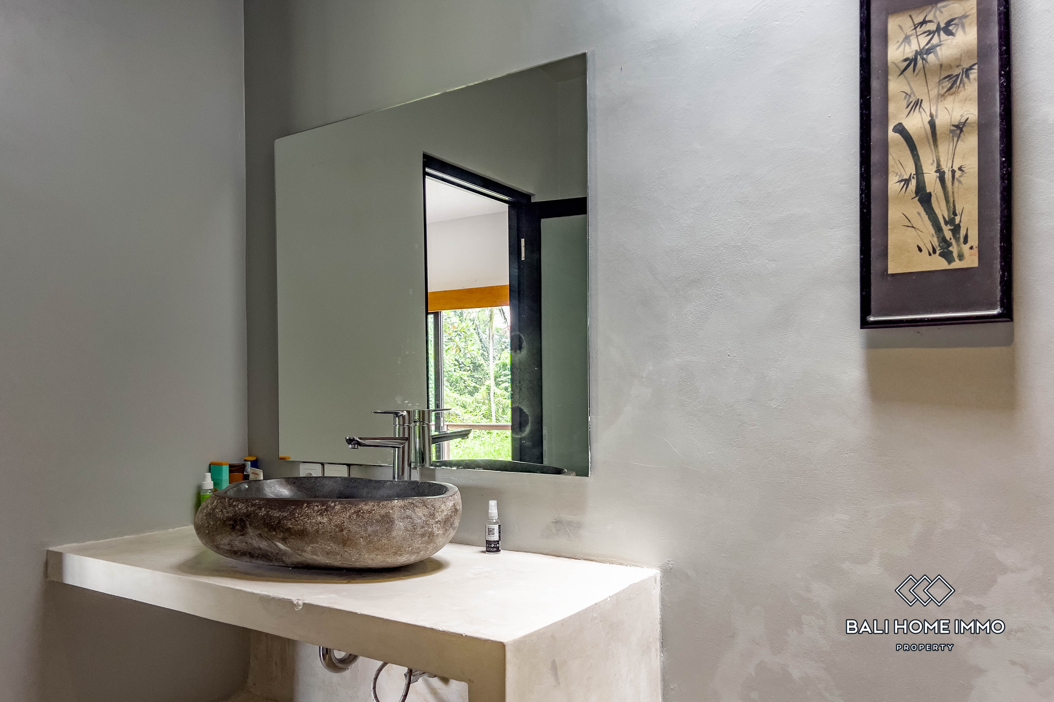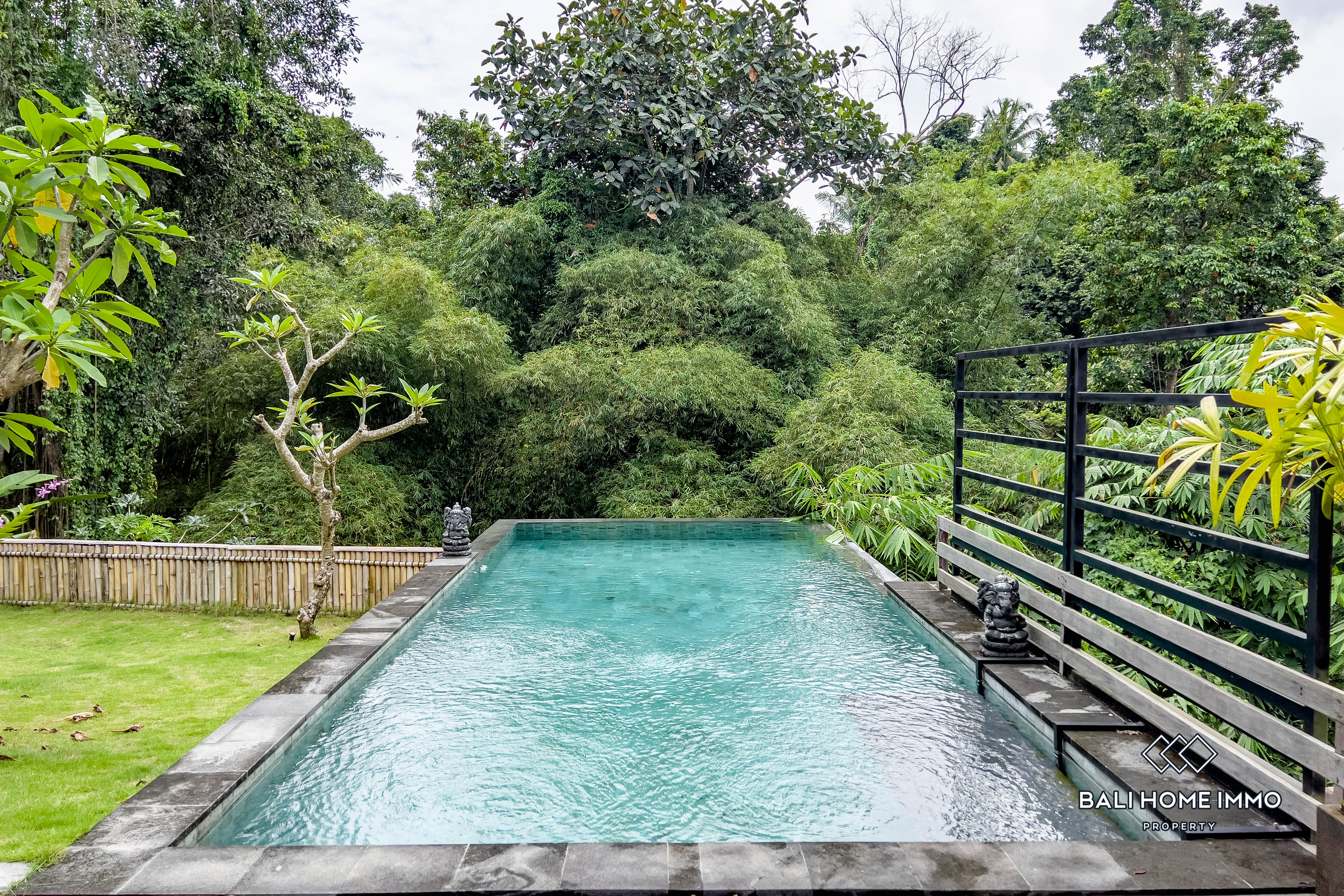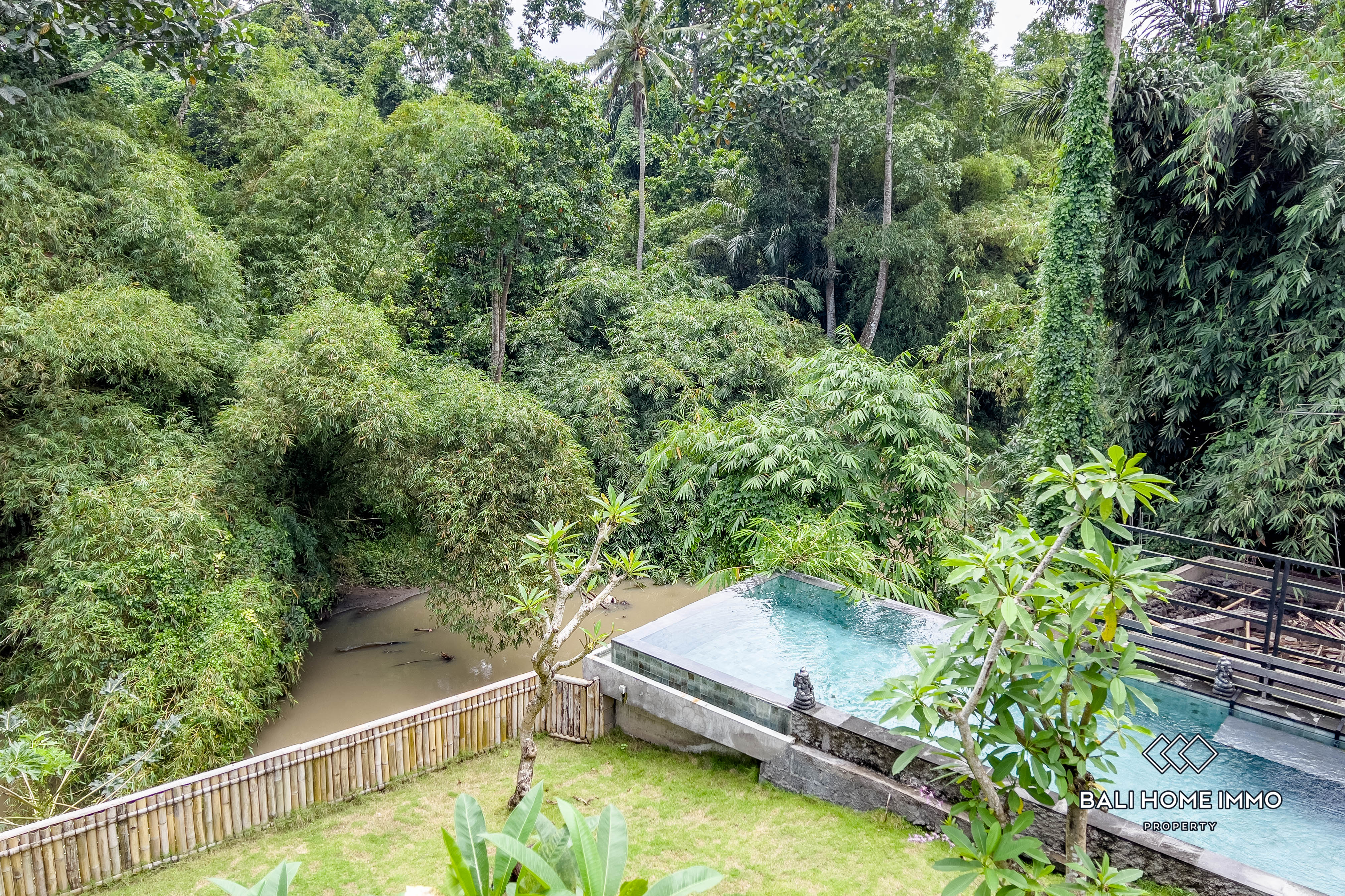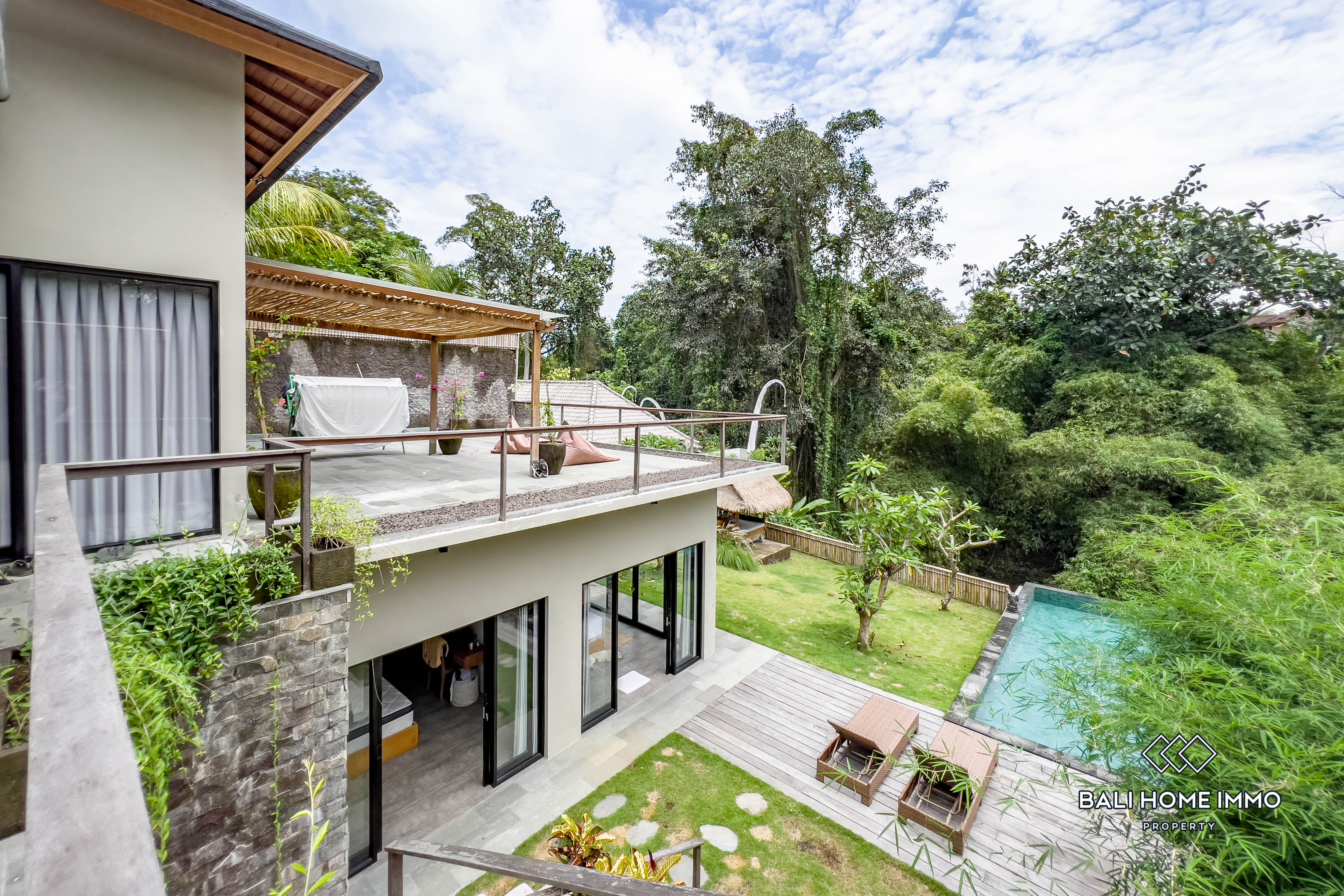 Serene and hidden, this villa is perched on a riverside and located in Cepaka, only a 9-minute drive from cafes and restaurants, and 15 minutes from trendy Canggu. Built on a generous 4,6-are land, this villa spans 2 levels with a 160m2 building. The top floor includes a spacious terrace with a pergola overlooking the surroundings that flow into the bright and ample open plan living and kitchen with soaring ceiling, featuring marble countertop and aesthetic backsplash. Right beside the living area, there is a sizable guest bedroom fitted with a double bed and ensuite. On the ground floor, there is another guest bedroom with similar features. The master suite is right beside it and is equipped with a full bathroom ensuite with a stunning pool and jungle view. A step outside the room is a sundeck with loungers by the 8-meter-long infinity pool, surrounded by an expansive manicured lawn with a relaxing gazebo overlooking the river and jungle. All in all, this villa is an excellent option for family and group vacation homes and investments and is available for a 16-year leasehold.