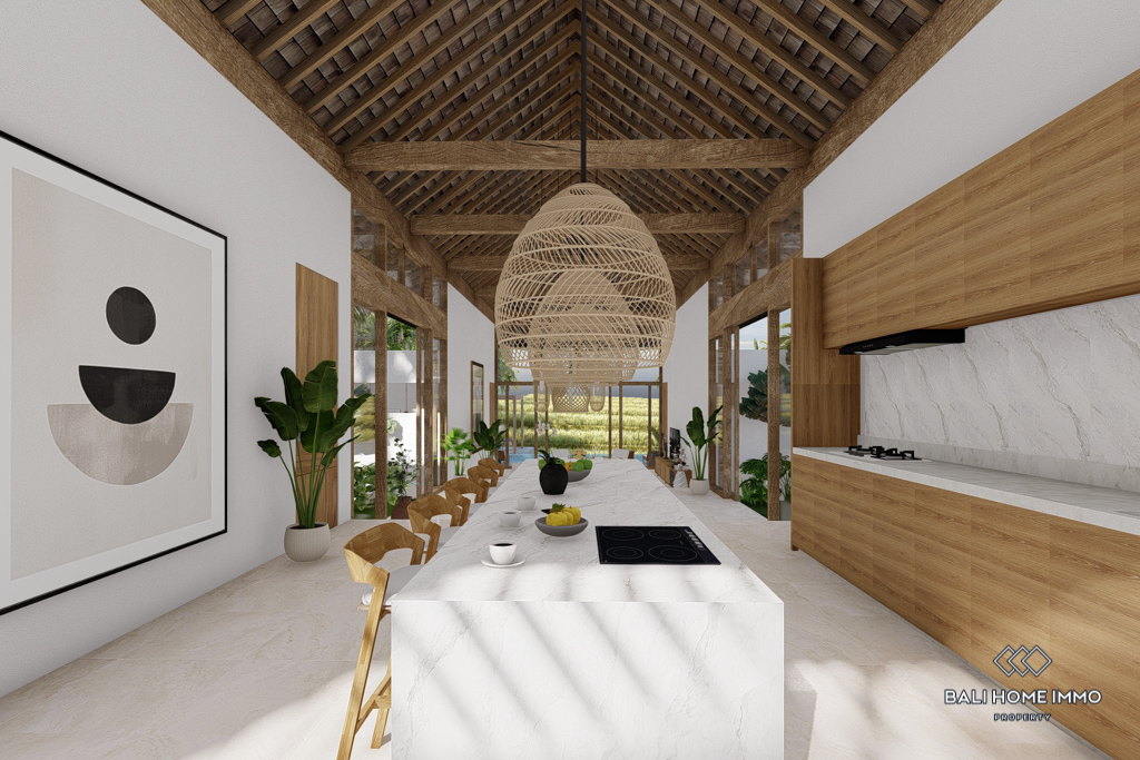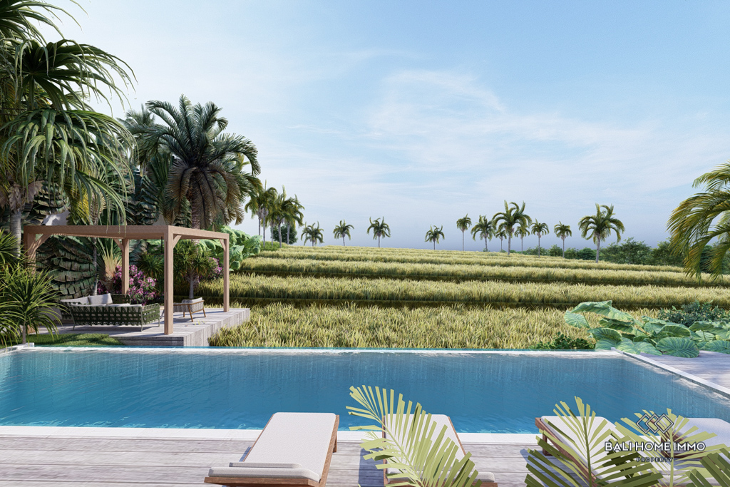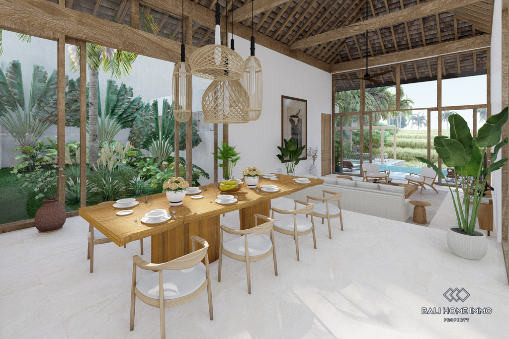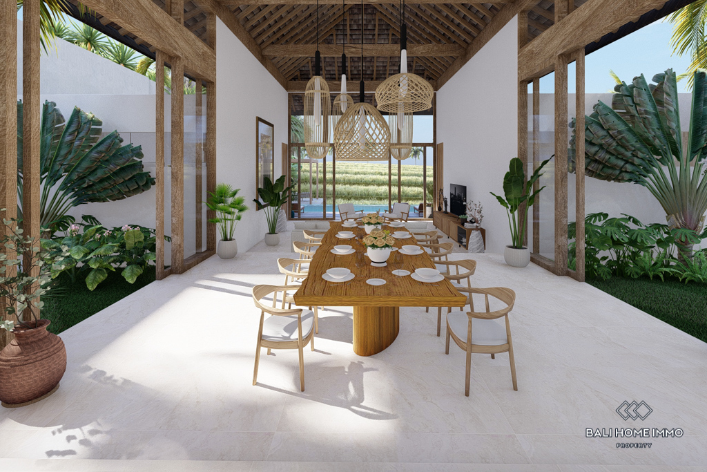 The villa features flexible living spaces that can be opened or enclosed, catering to different preferences and weather conditions. With five ensuite bathrooms, the villa ensures privacy and comfort for all residents. Semi-furnished with contemporary decor, the villa boasts beautiful rice field views. Outdoors, a swimming pool offers a perfect spot for relaxation and leisure. With a generous 32-year leasehold period, this villa presents an excellent investment opportunity in a peaceful location.