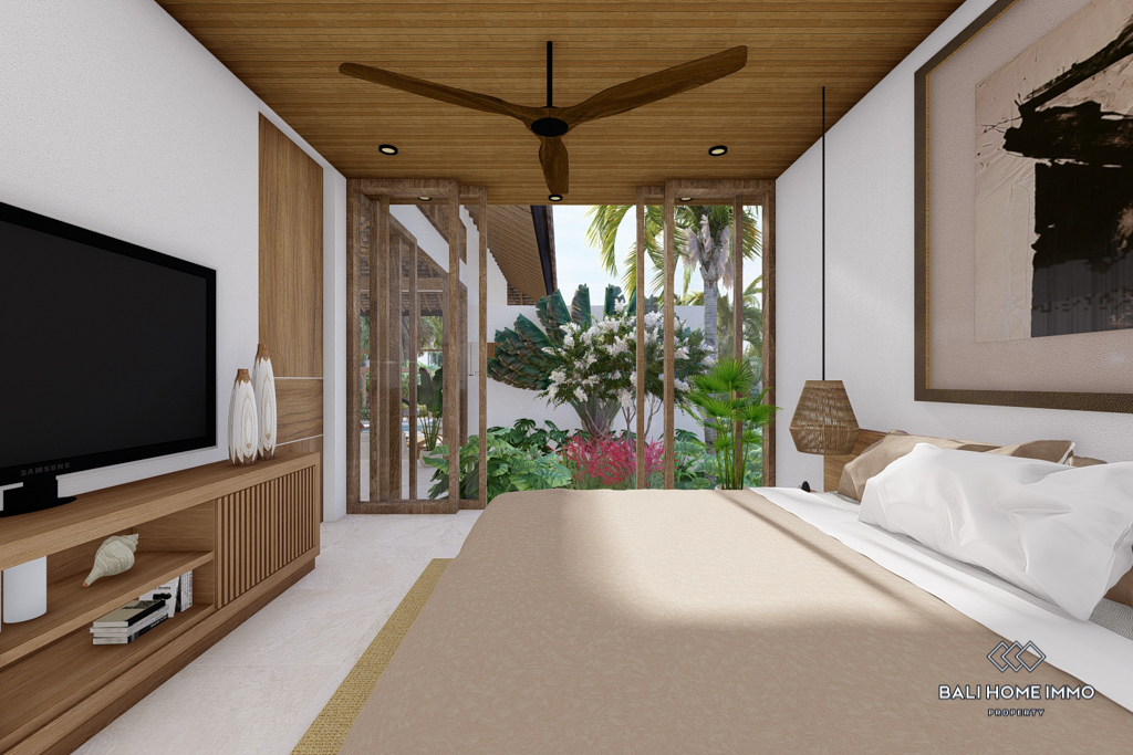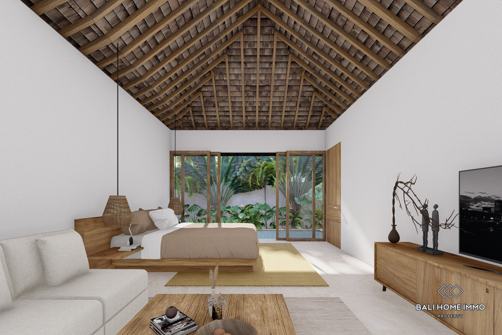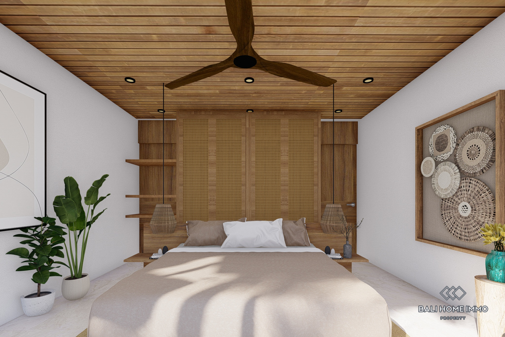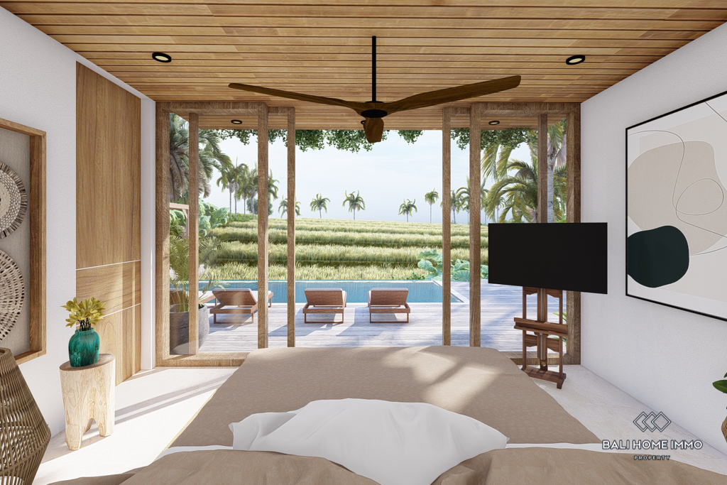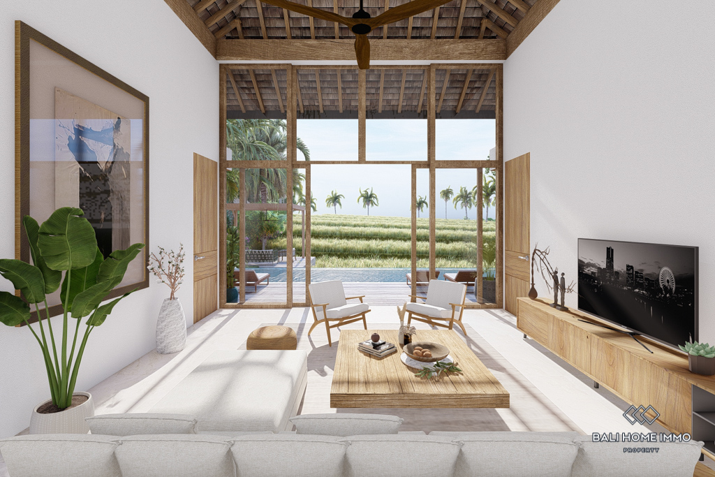 The villa features flexible living spaces that can be opened or enclosed, catering to different preferences and weather conditions. With five ensuite bathrooms, the villa ensures privacy and comfort for all residents. Semi-furnished with contemporary decor, the villa boasts beautiful rice field views. Outdoors, a swimming pool offers a perfect spot for relaxation and leisure. With a generous 32-year leasehold period, this villa presents an excellent investment opportunity in a peaceful location.