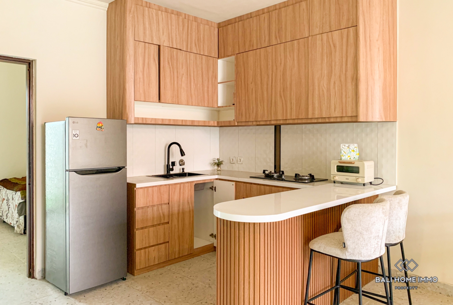The enclosed living and kitchen area provides a comfortable air conditioned environment for daily living and entertaining. The modern kitchen is fully equipped with sleek cabinetry and practical appliances, flowing naturally into a cozy dining and lounge space. Located in a peaceful area of Ubud, the villa offers a quiet retreat within close reach of cafes, wellness spots, and cultural attractions, making it perfect for anyone seeking comfort, privacy, and convenience in one beautiful home.