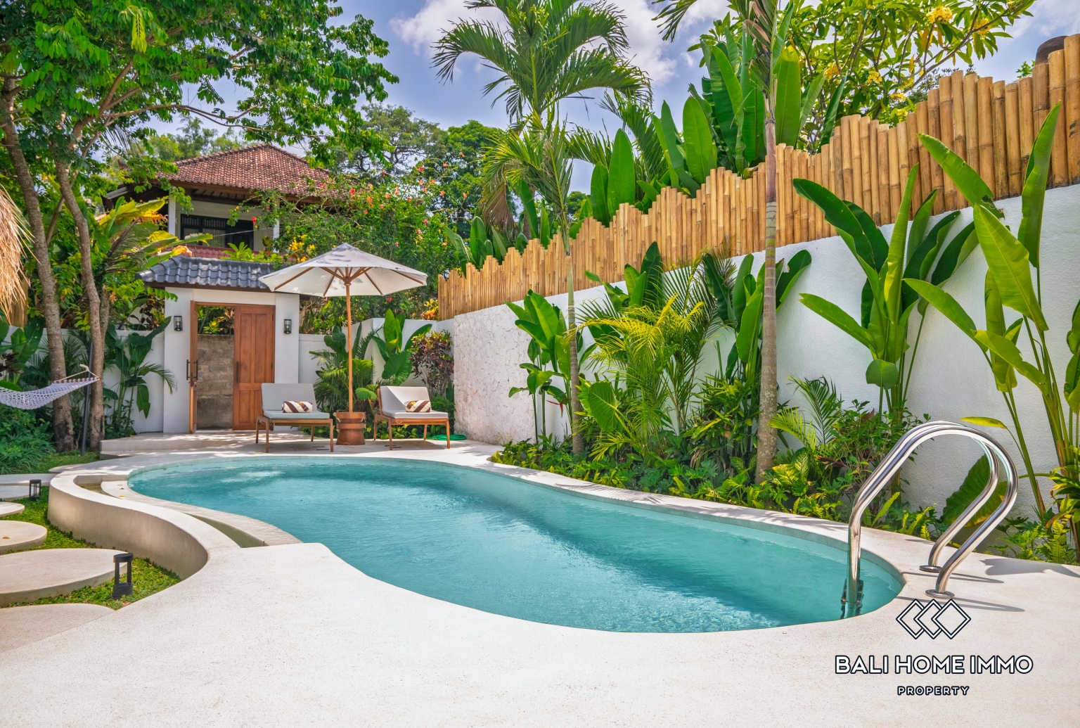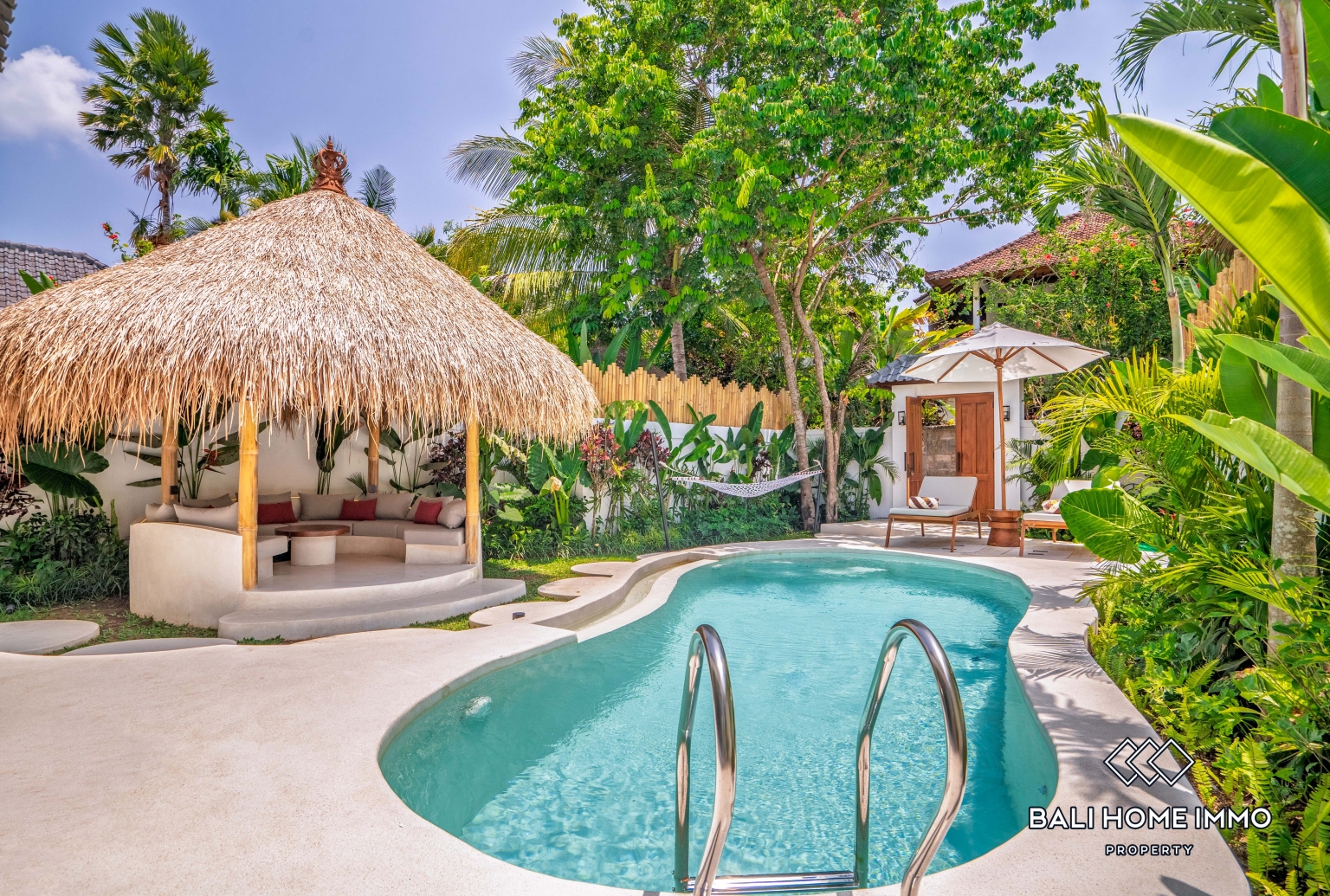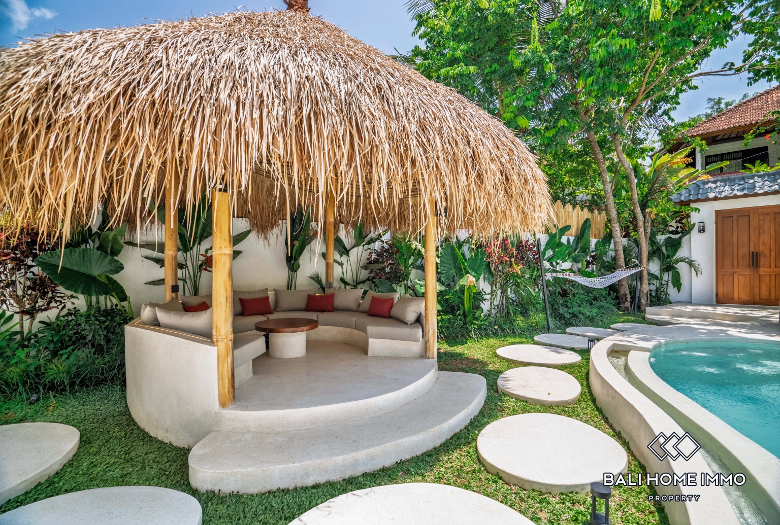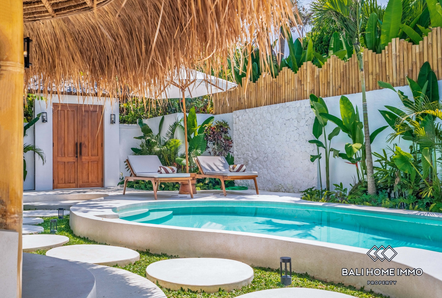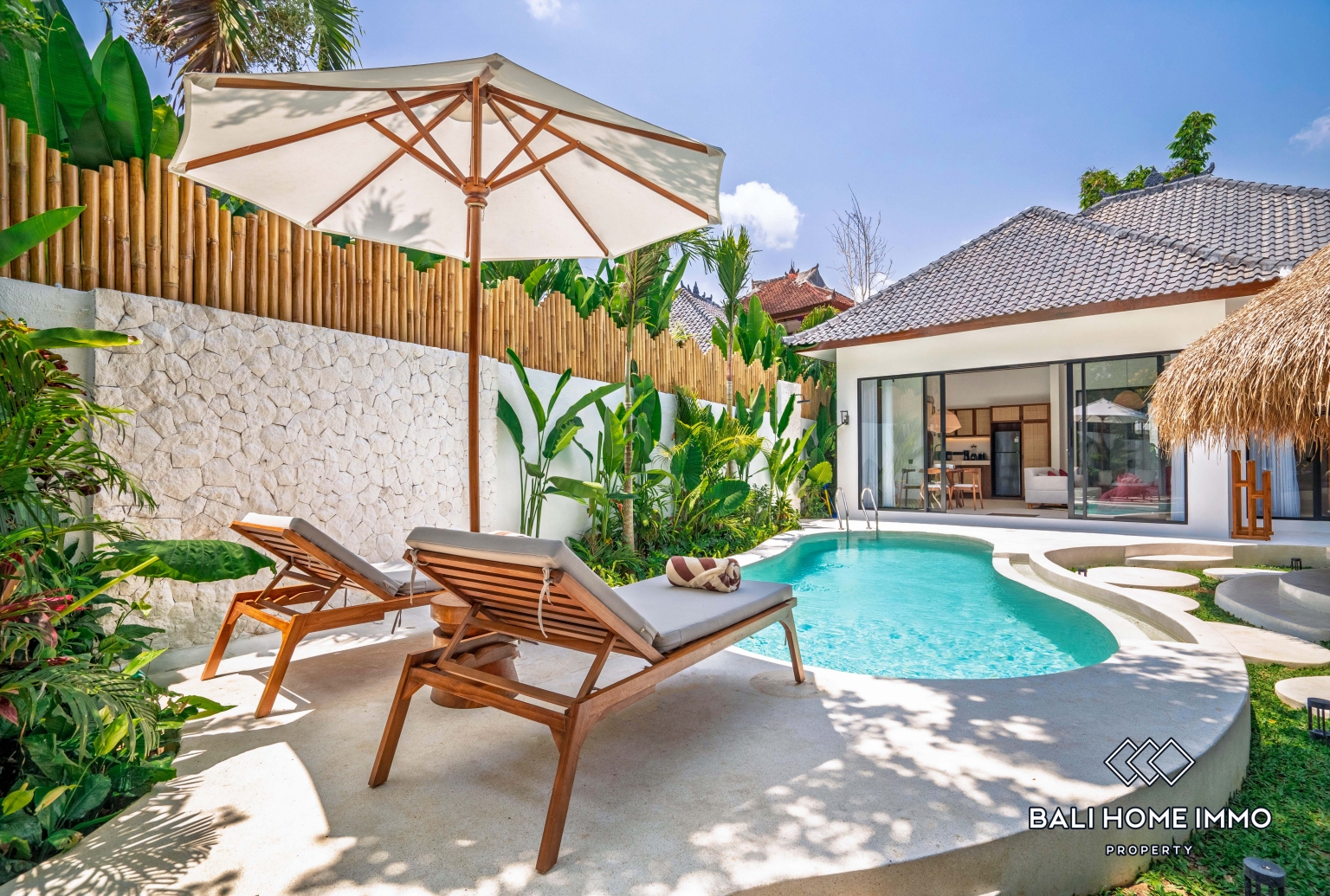 Outside, the villa opens to a refreshing private swimming pool surrounded by a stylish terrace, perfect for sunbathing, morning coffee, or evening relaxation. Lush tropical landscaping enhances the peaceful ambiance, creating your own personal oasis filled with greenery and tranquility.