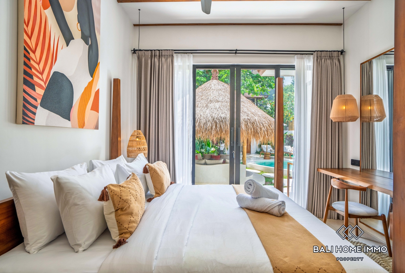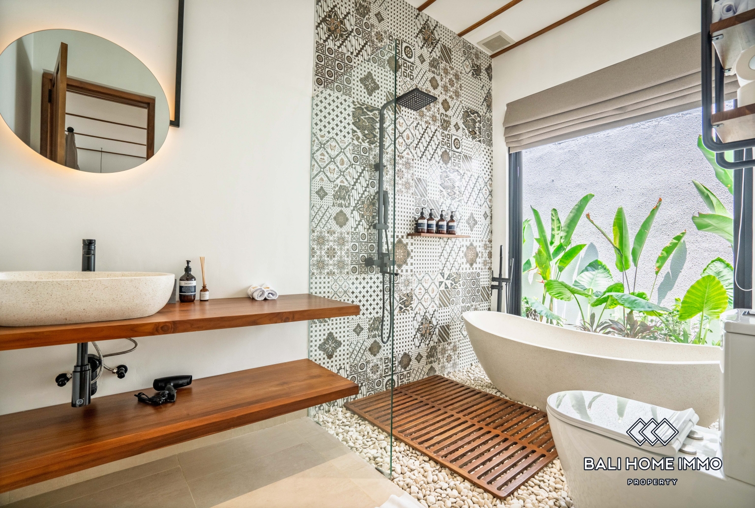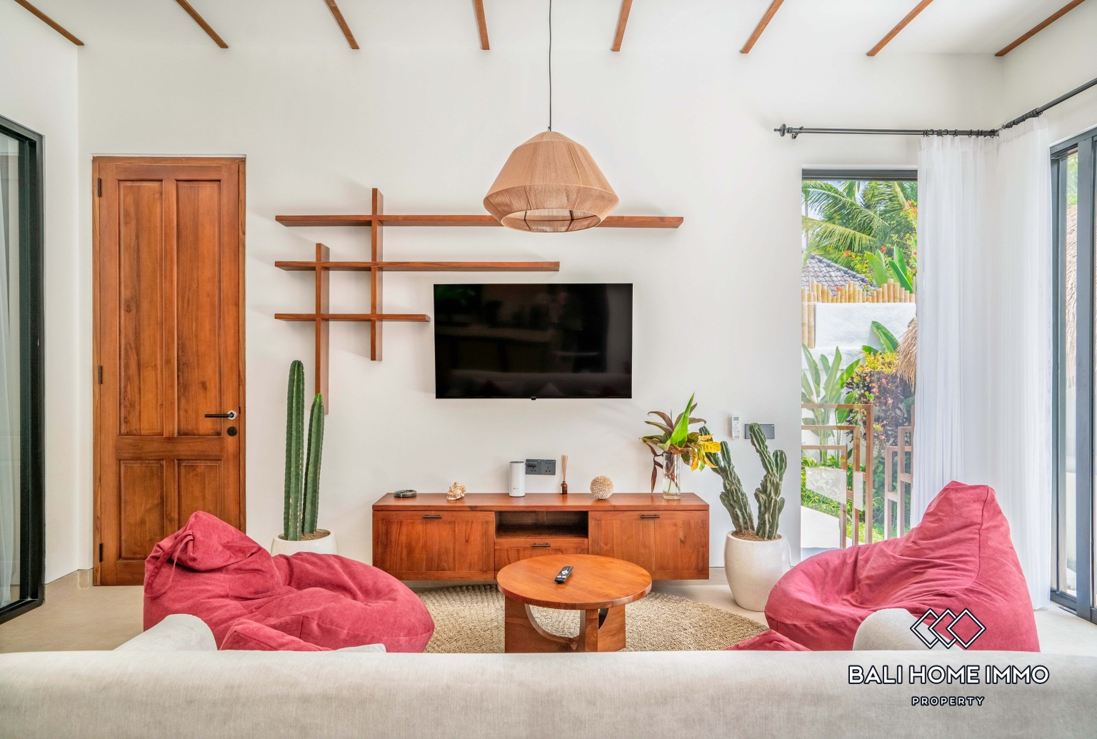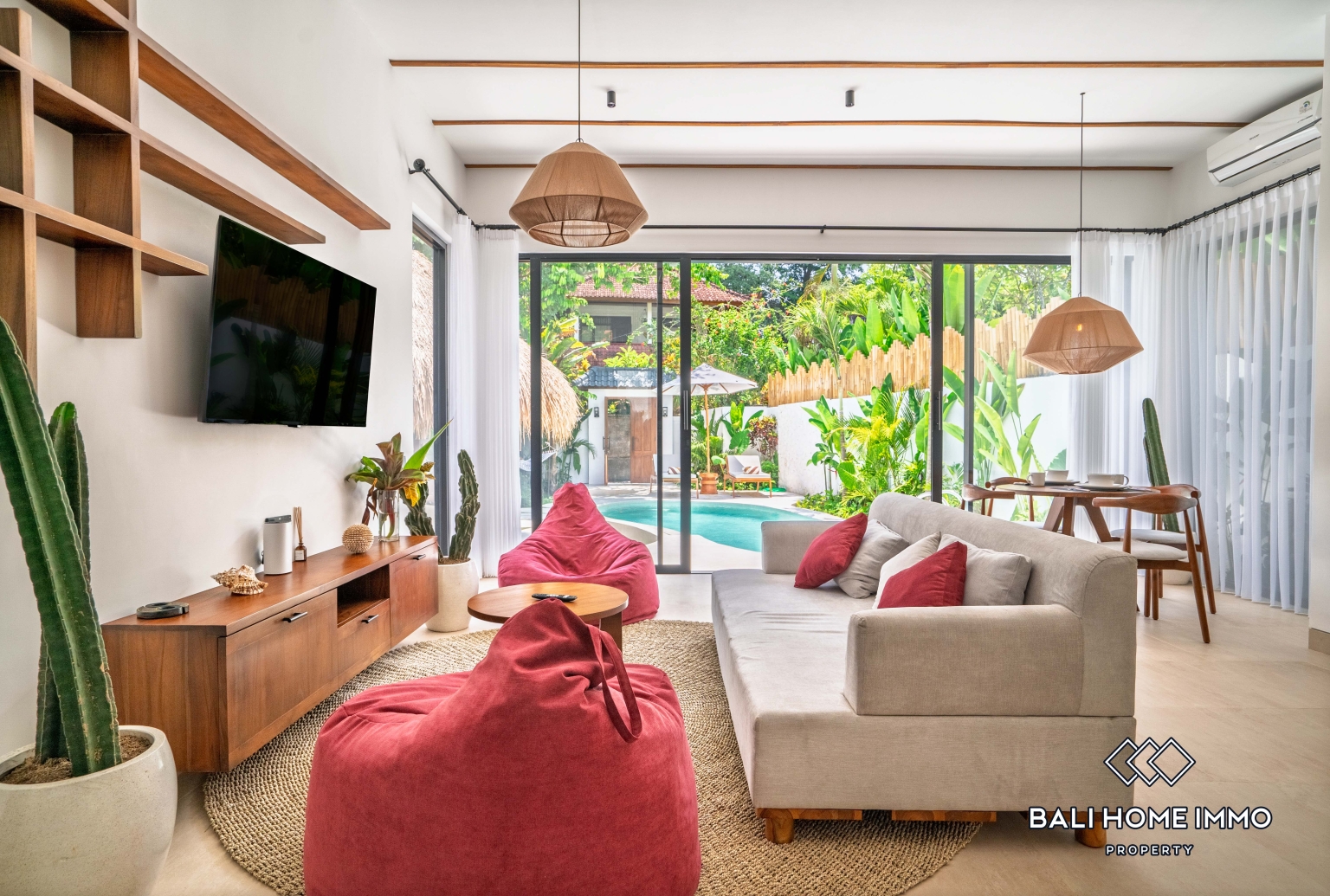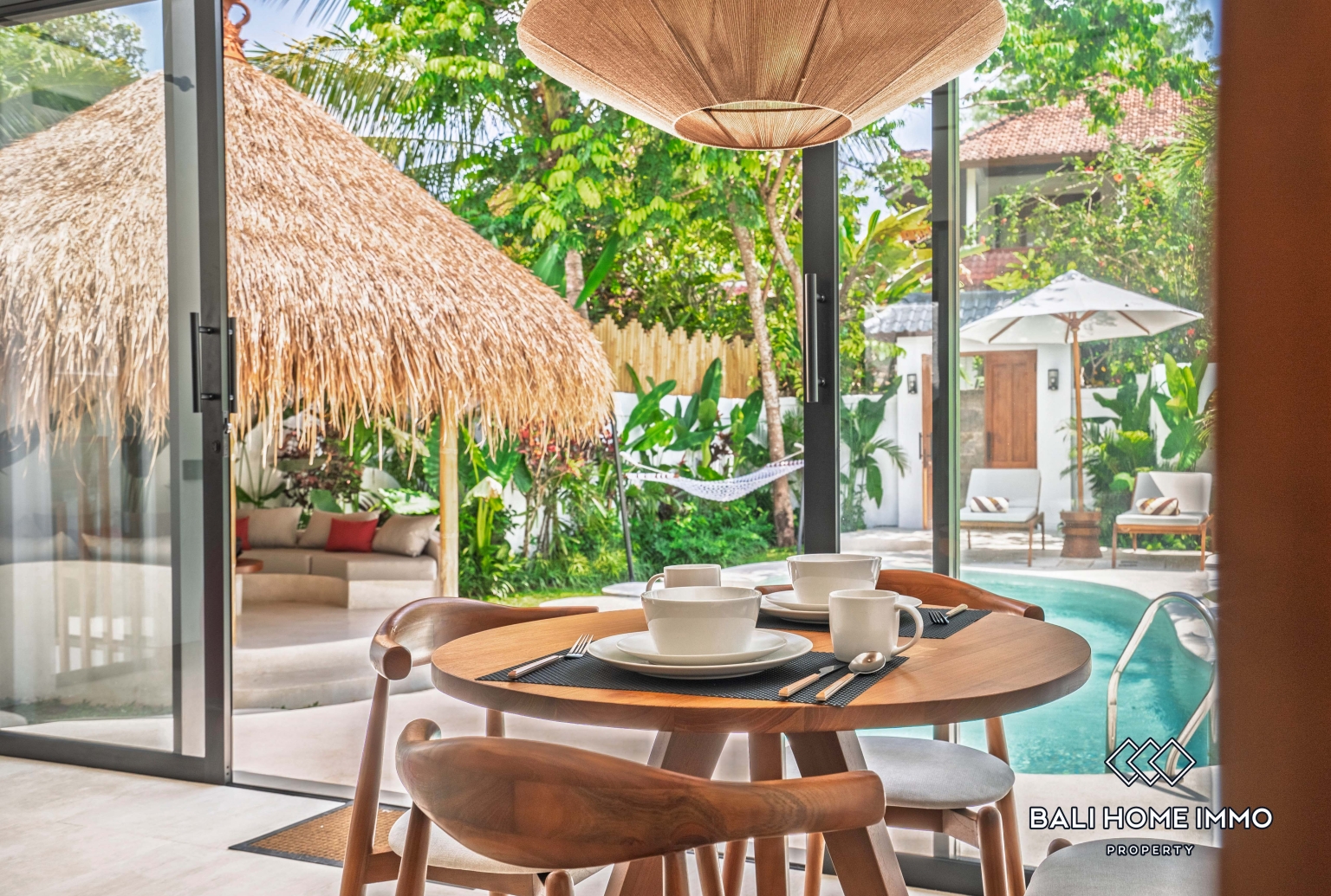 Outside, the villa opens to a refreshing private swimming pool surrounded by a stylish terrace, perfect for sunbathing, morning coffee, or evening relaxation. Lush tropical landscaping enhances the peaceful ambiance, creating your own personal oasis filled with greenery and tranquility.