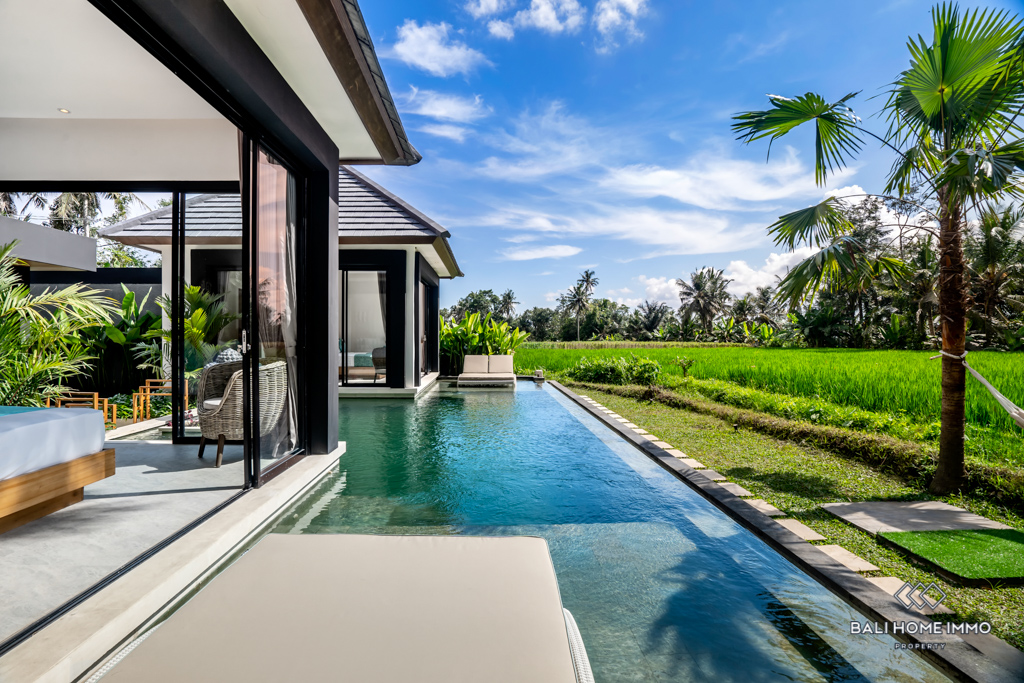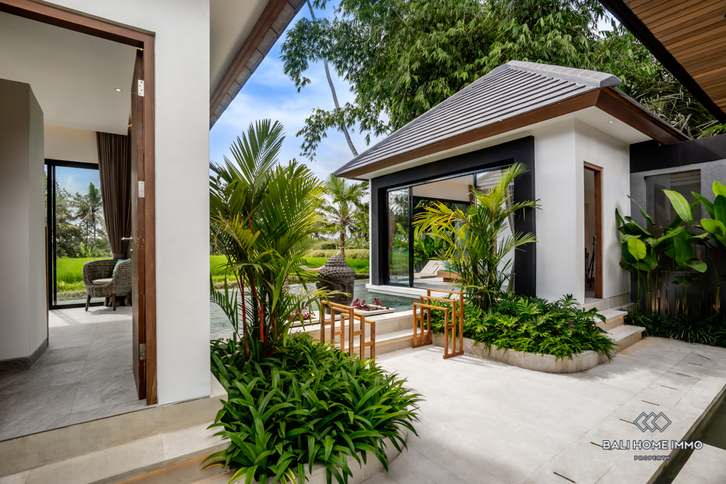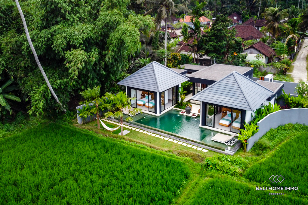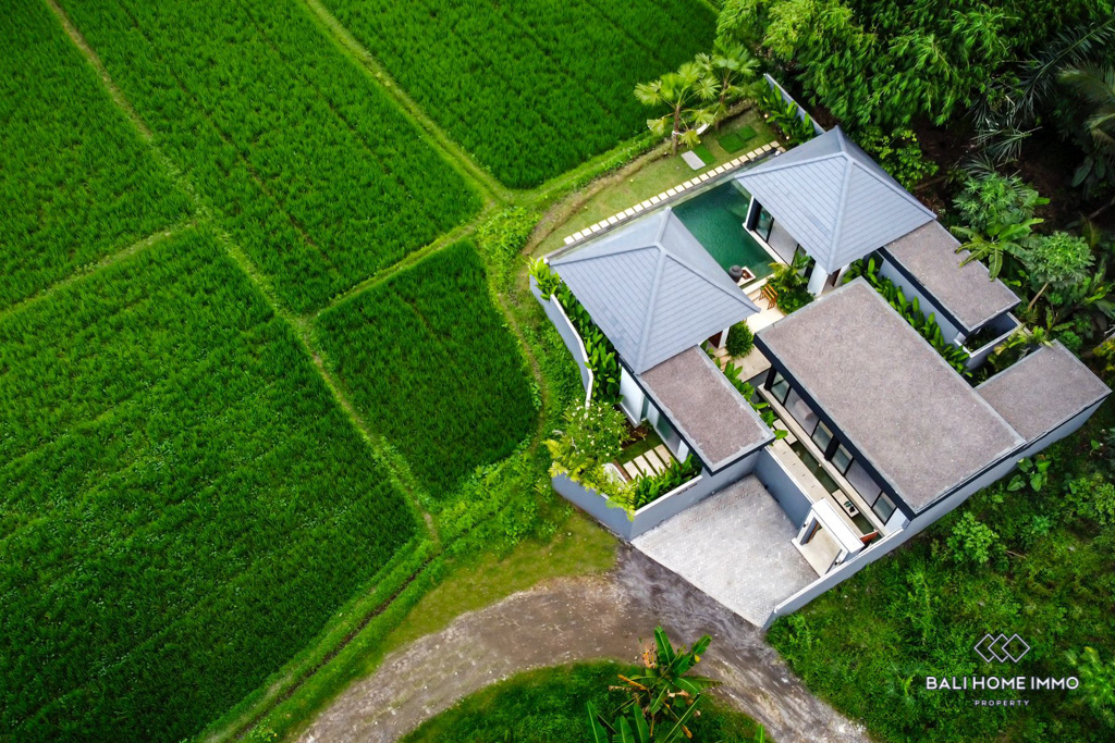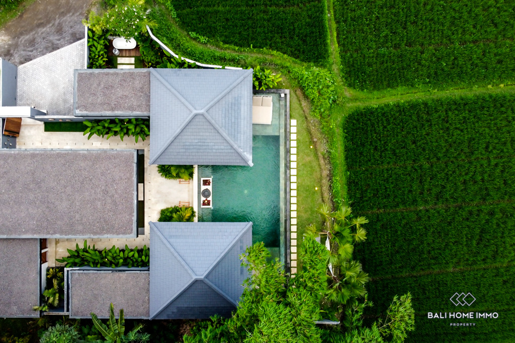 Nestled in the heart of Ubud, this modern villa offers an enchanting escape surrounded by the lush beauty of Bali's iconic rice fields. Situated on a 4-are land, this single-story gem boasts a harmonious blend of contemporary design and natural serenity.