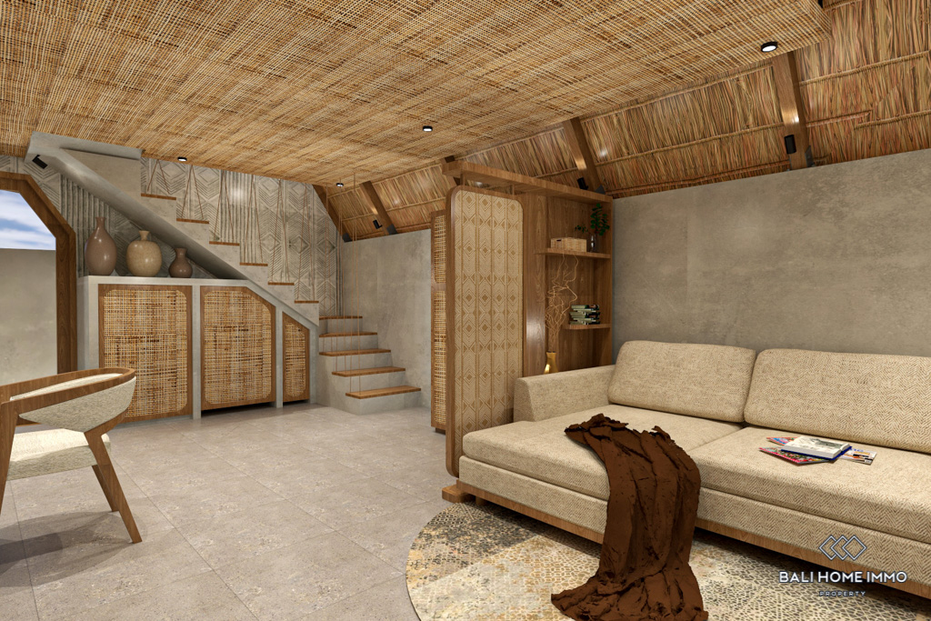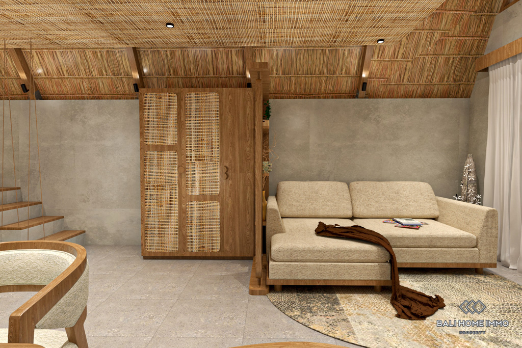 This villa's Boho style is inspired by the captivating architecture of the Toraja's traditional Tongkonan houses. It boasts of striking roofing that can be considered a piece of art. You can relax and enjoy your morning coffee on the ample terrace before the entry. Inside, the villa's living room, dining area, and kitchenette provide a cozy space for relaxation, while the bathroom offers convenience. On the mezzanine floor, you'll find a well-appointed bedroom with a vaulted ceiling. The hotel's focal point is the lounge seating between the two shared pools. This fully furnished villa is ready for you to move in.