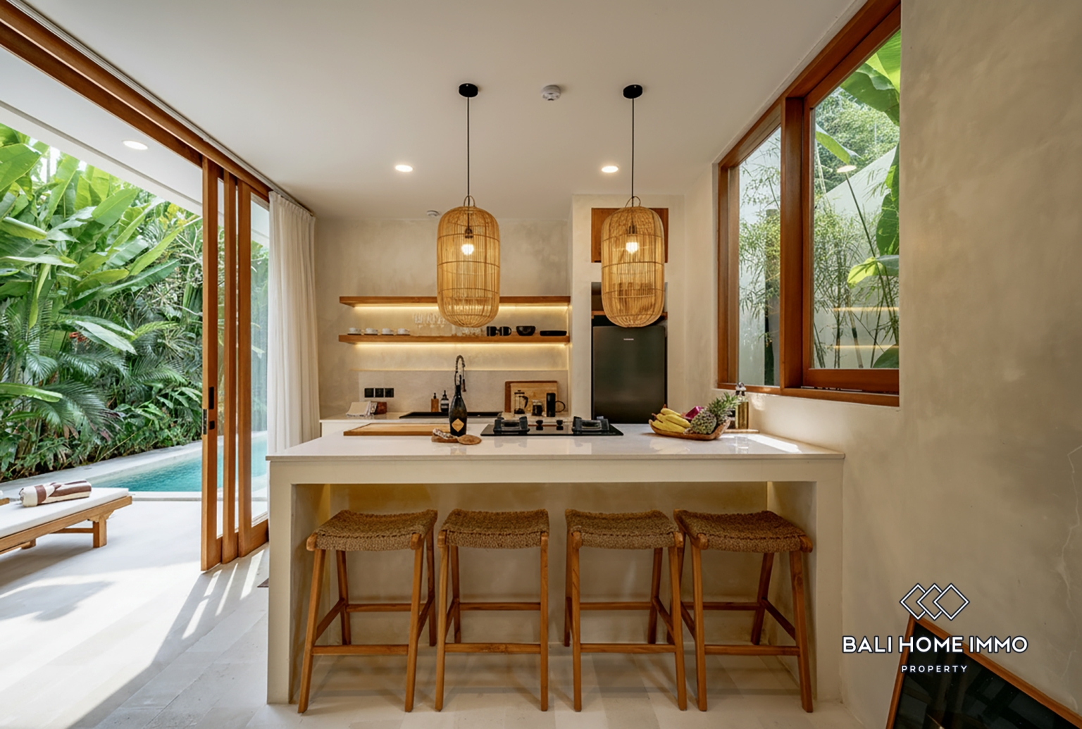 The villa features two comfortable bedrooms, each with its own ensuite bathroom, ensuring privacy and convenience for both residents and guests. Fully furnished and move-in ready, the interiors are designed with a warm tropical aesthetic that complements the surrounding landscape. Large openings allow natural light to flow through the space, creating a bright and airy ambiance throughout the home.