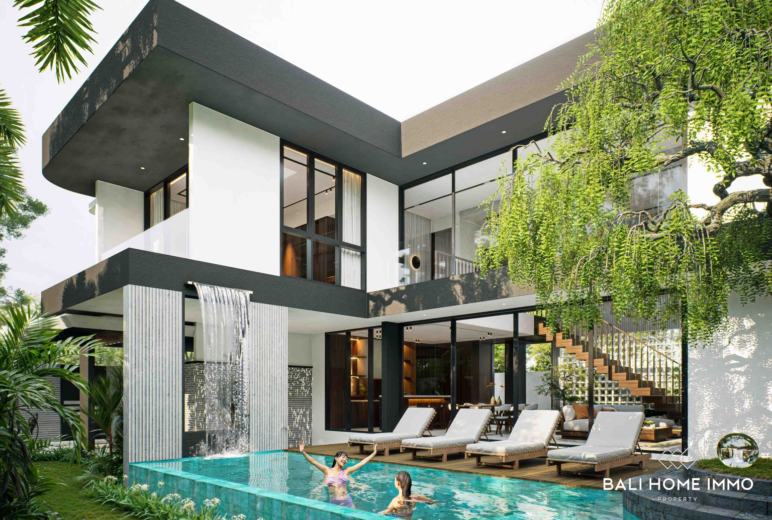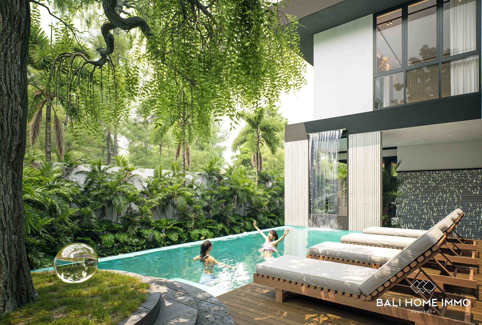 The villa features a striking double-height living area that enhances natural light and airflow, creating a bright and spacious atmosphere throughout the home. Floor-to-ceiling glass doors connect the indoor living spaces seamlessly with the outdoor area, allowing residents to enjoy Baliโs tropical climate and garden surroundings.The outdoor space is designed as a private retreat, featuring a swimming pool with a waterfall feature, sun loungers, and landscaped greenery that provide a relaxing resort-style ambiance. Inside, the villa offers a spacious open-plan living and dining area, a modern kitchen, and three well-appointed bedrooms designed for comfort and privacy. Thoughtfully designed for both lifestyle and investment purposes, this villa offers a perfect balance between modern architecture and tropical living.