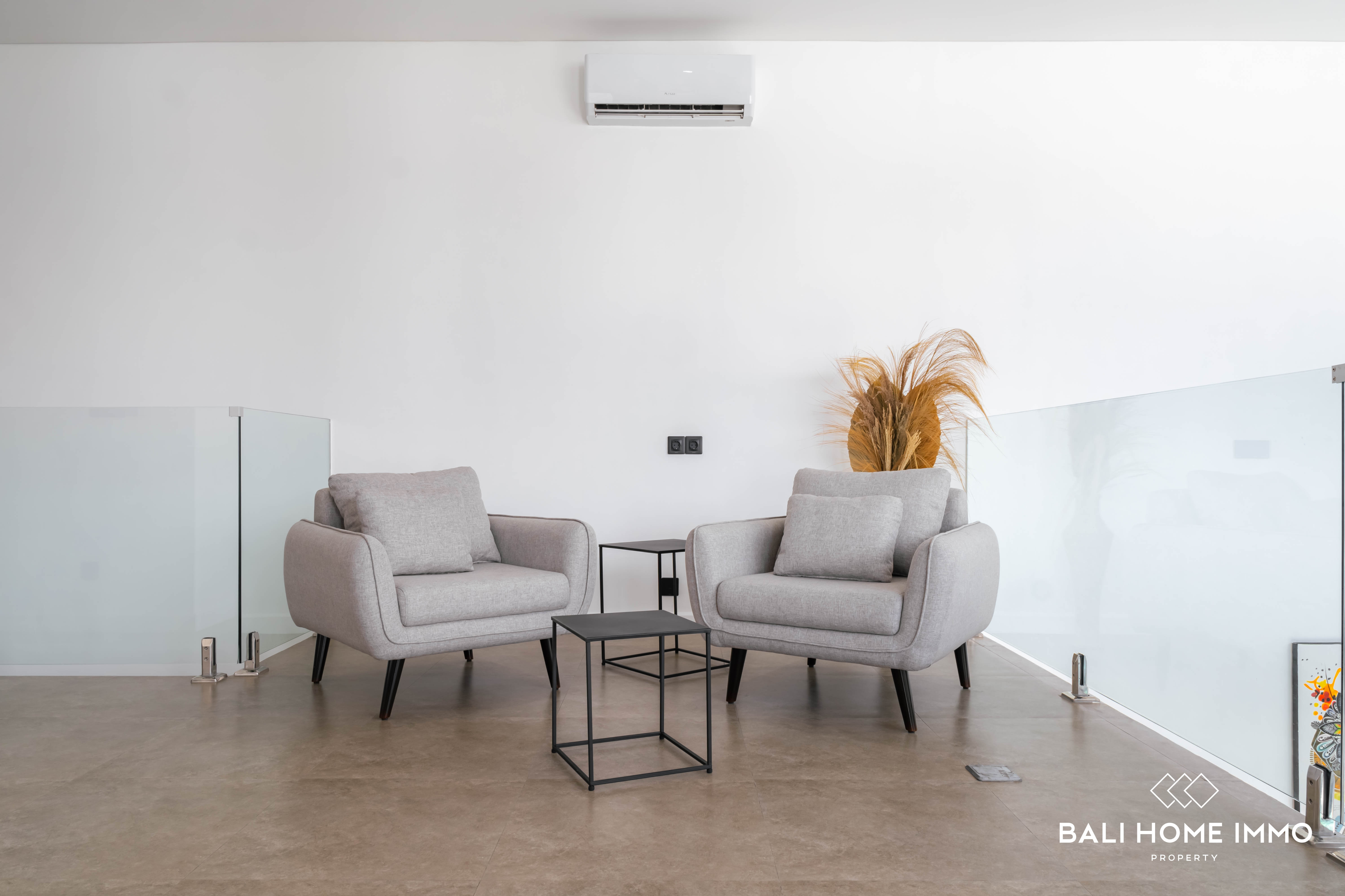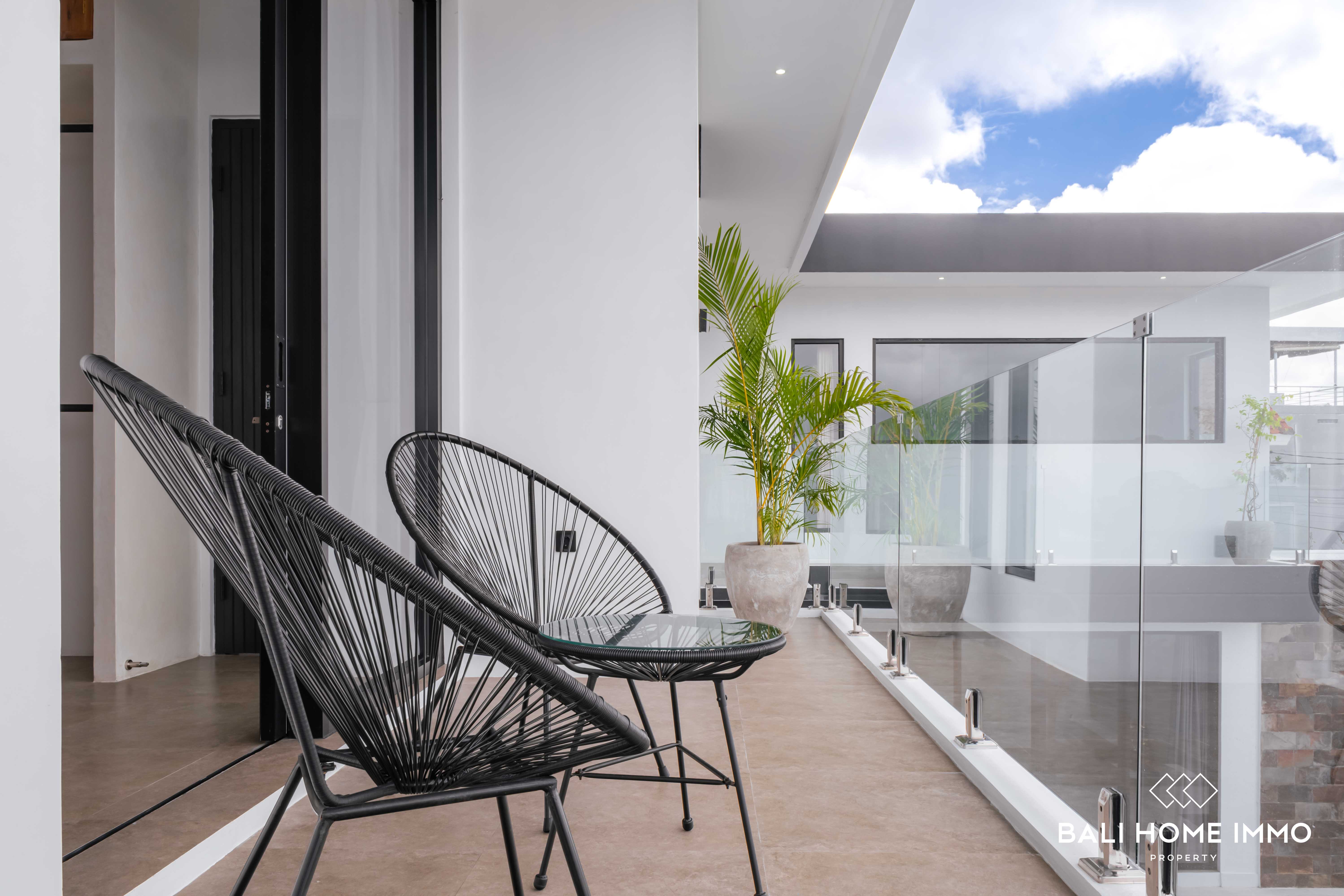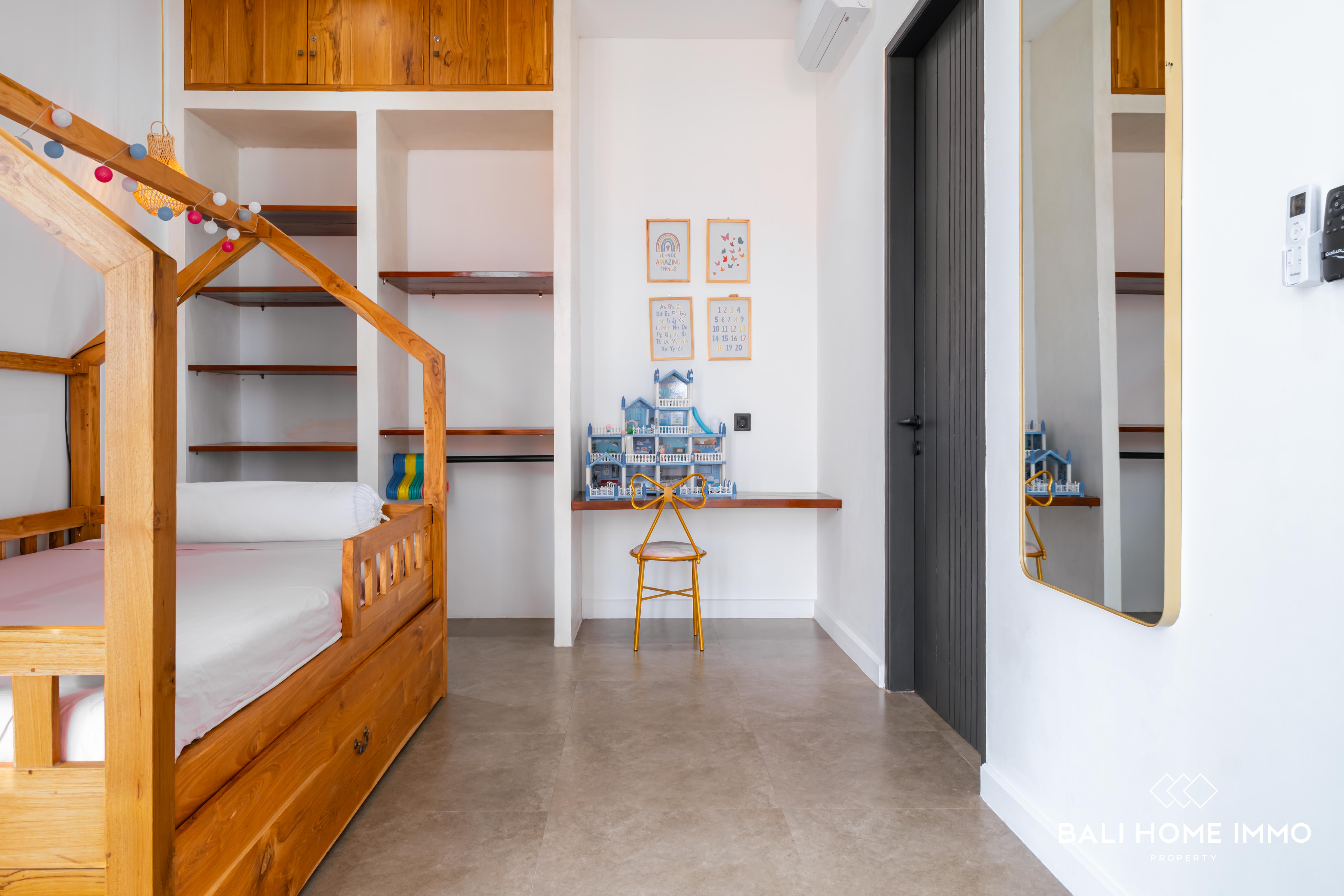 On the second floor, you'll find three additional bedrooms, each with its own ensuite bathroom, ensuring privacy and comfort for all residents. There is also a versatile corner space that can be used as a childโs play area or a second living room, along with a balcony overlooking the pool. With a 28-year lease and the option to extend, this villa is an ideal home for families seeking flexible mobility in a prime location or an excellent opportunity for a holiday or investment property in Bali.