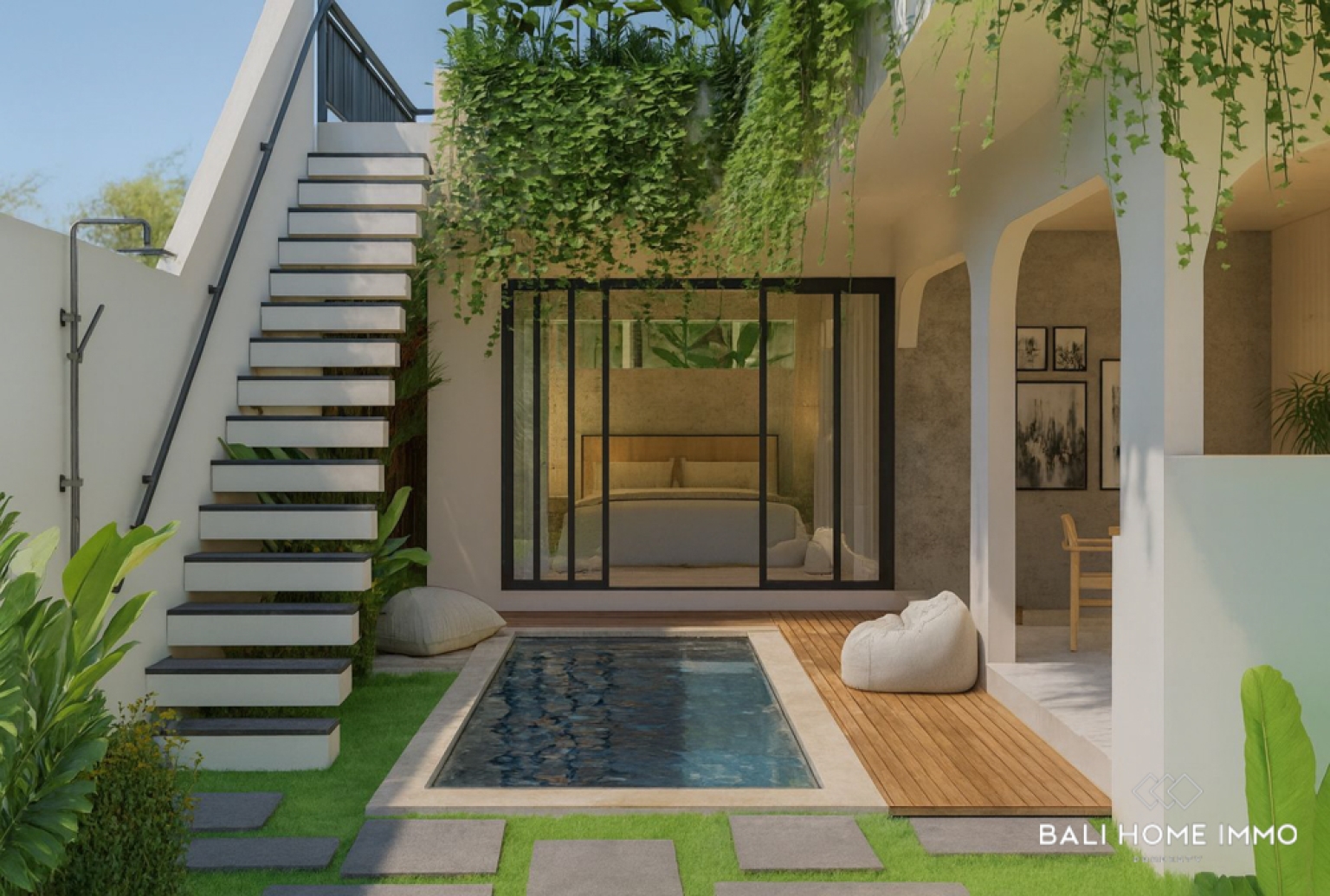 Designed in a sleek modern minimalist style, the property is complemented by a private swimming pool, providing a peaceful setting to relax and enjoy the tropical surroundings. Large glass openings invite natural light and offer a smooth indoorโoutdoor flow, making the villa feel spacious and inviting despite its compact footprint.