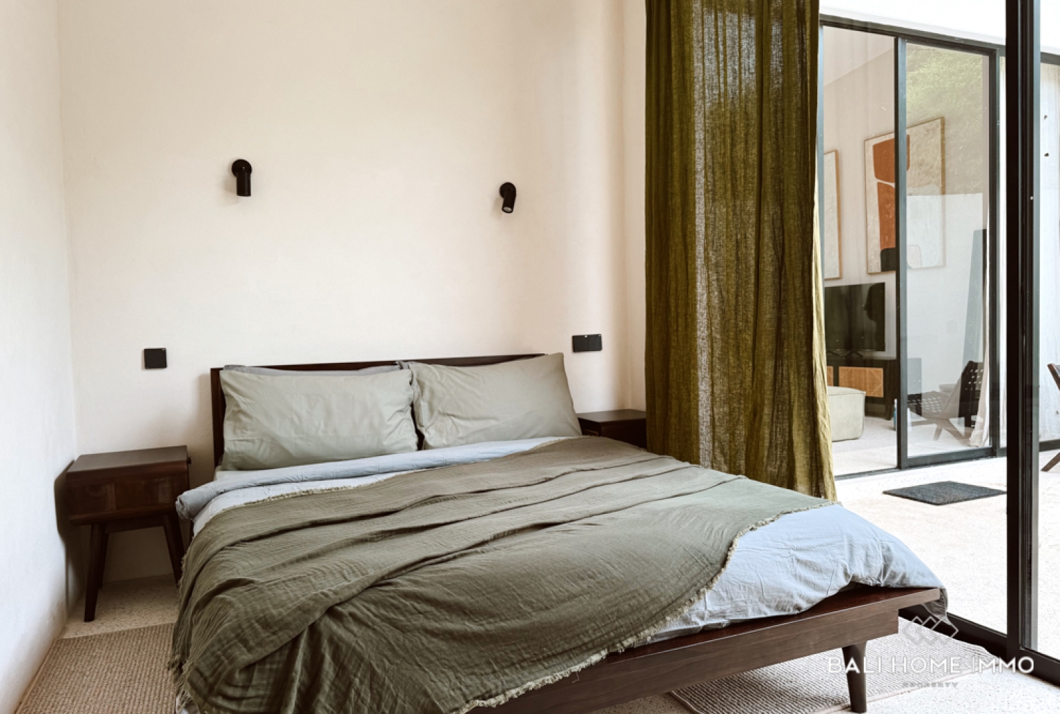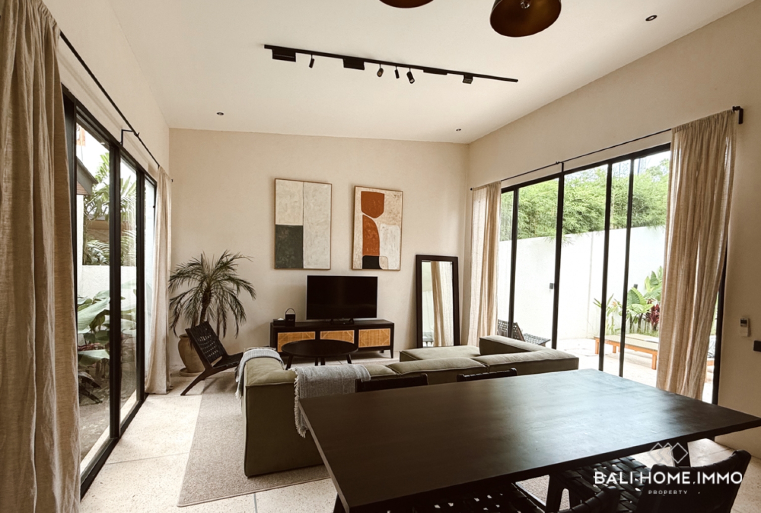 The villa is thoughtfully designed on a single level, featuring two comfortable bedrooms, each with an ensuite bathroom. The enclosed living and kitchen area provides a cozy yet functional space, ideal for everyday living or accommodating guests. Large openings connect the interior to the outdoor area, allowing natural light to flow throughout the home.
